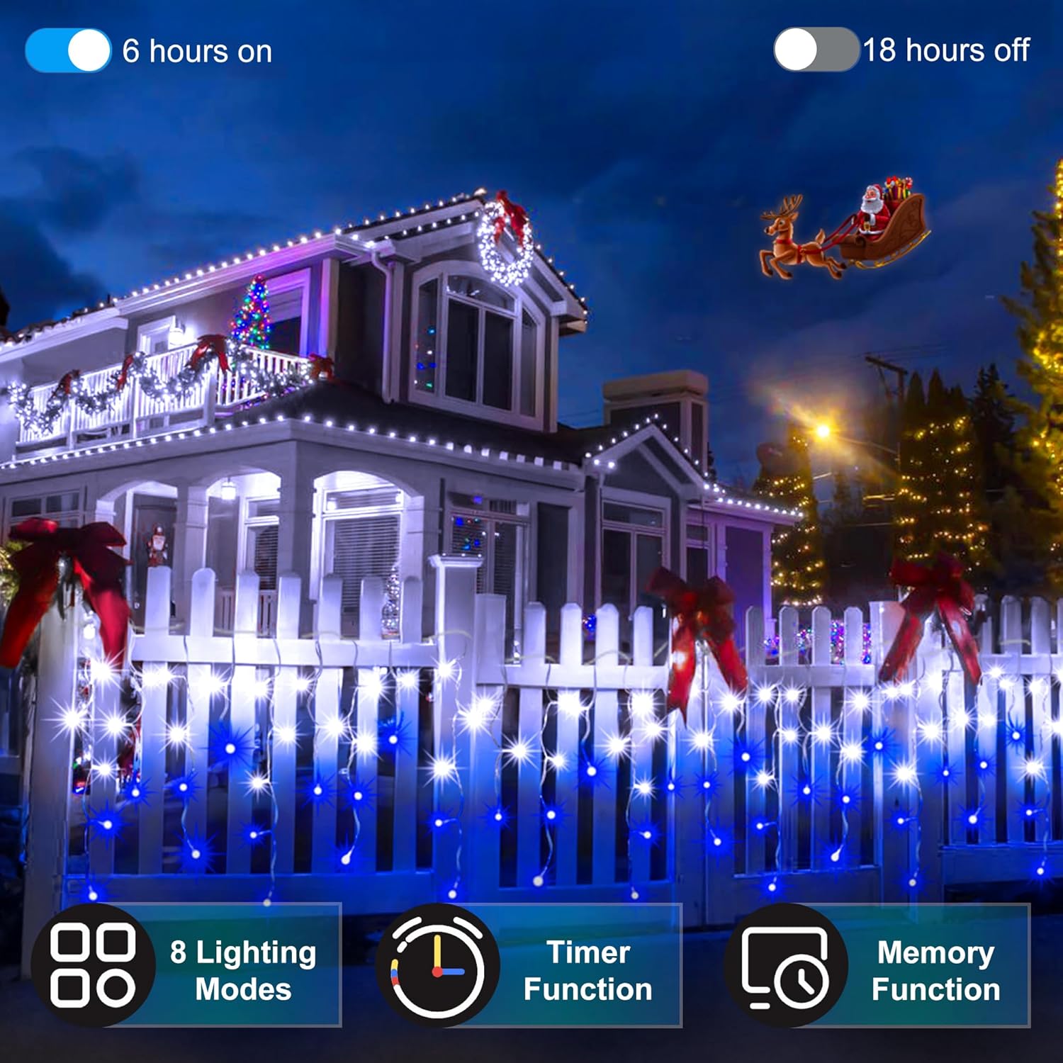- Enjoy Hands-Free Holiday Magic: With the built-in timer feature, these outdoor christmas lights turn on and off automatically at the same time each day, freeing you from the hassle of manual operation. Set the perfect glow for your home to welcome family and friends, knowing the lights will illuminate your home like clockwork. The festive spirit never fades with this easy, hands-free function