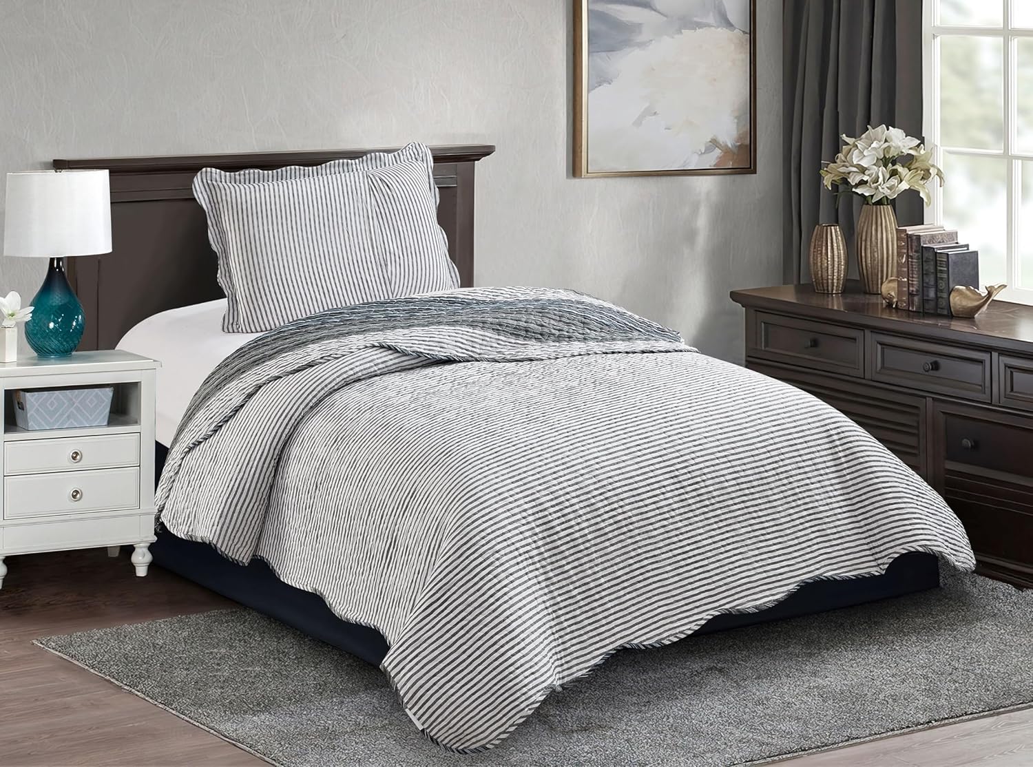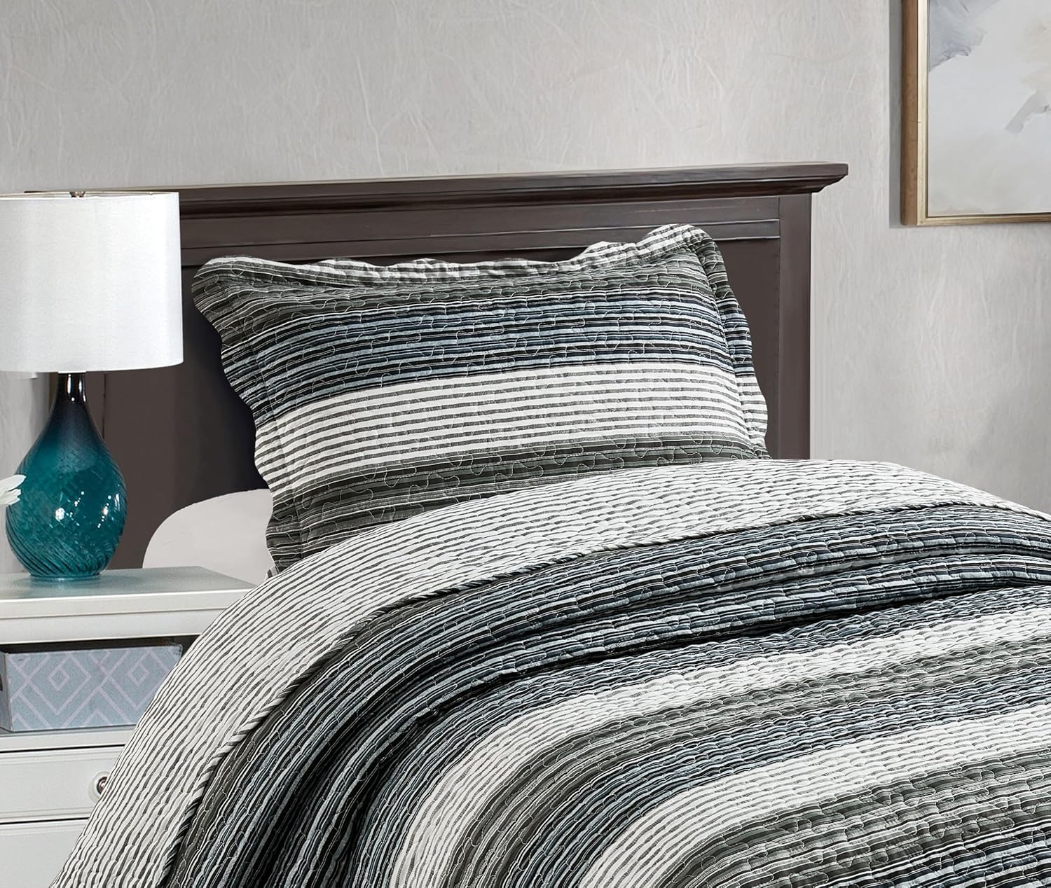 Brilliant Sunshine Multi Grey Stripes Patchwork, 2-Piece Quilt Set with 1 Sham, Reversible Bedspread, Soft Lightweight Coverlet, All-Season, Twin, Multi Grey