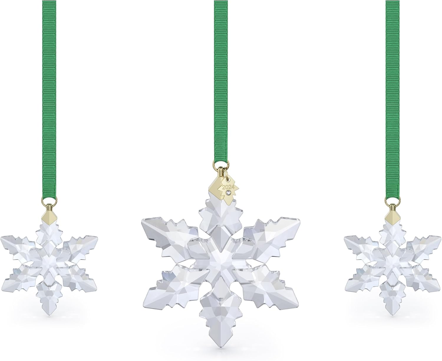 - The set includes two smaller ornaments and one large snowflake, which additionally features a tag engraved with “2024