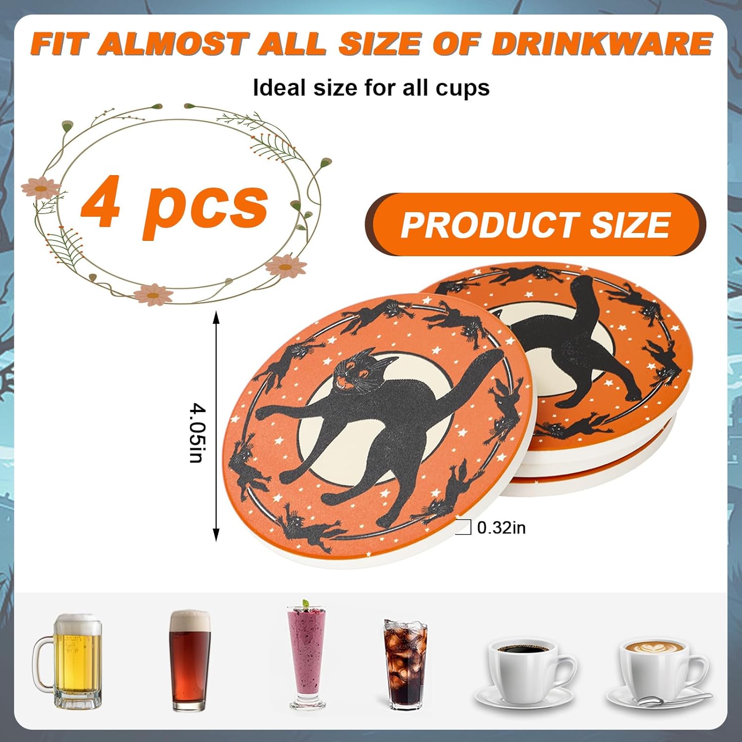 - DELICATE DESIGN: Our coasters are Halloween themed, taking orange as the background color, patterned with black cats, vintage and eye-catching, which will be the perfect complement to your Halloween and everyday table decor.