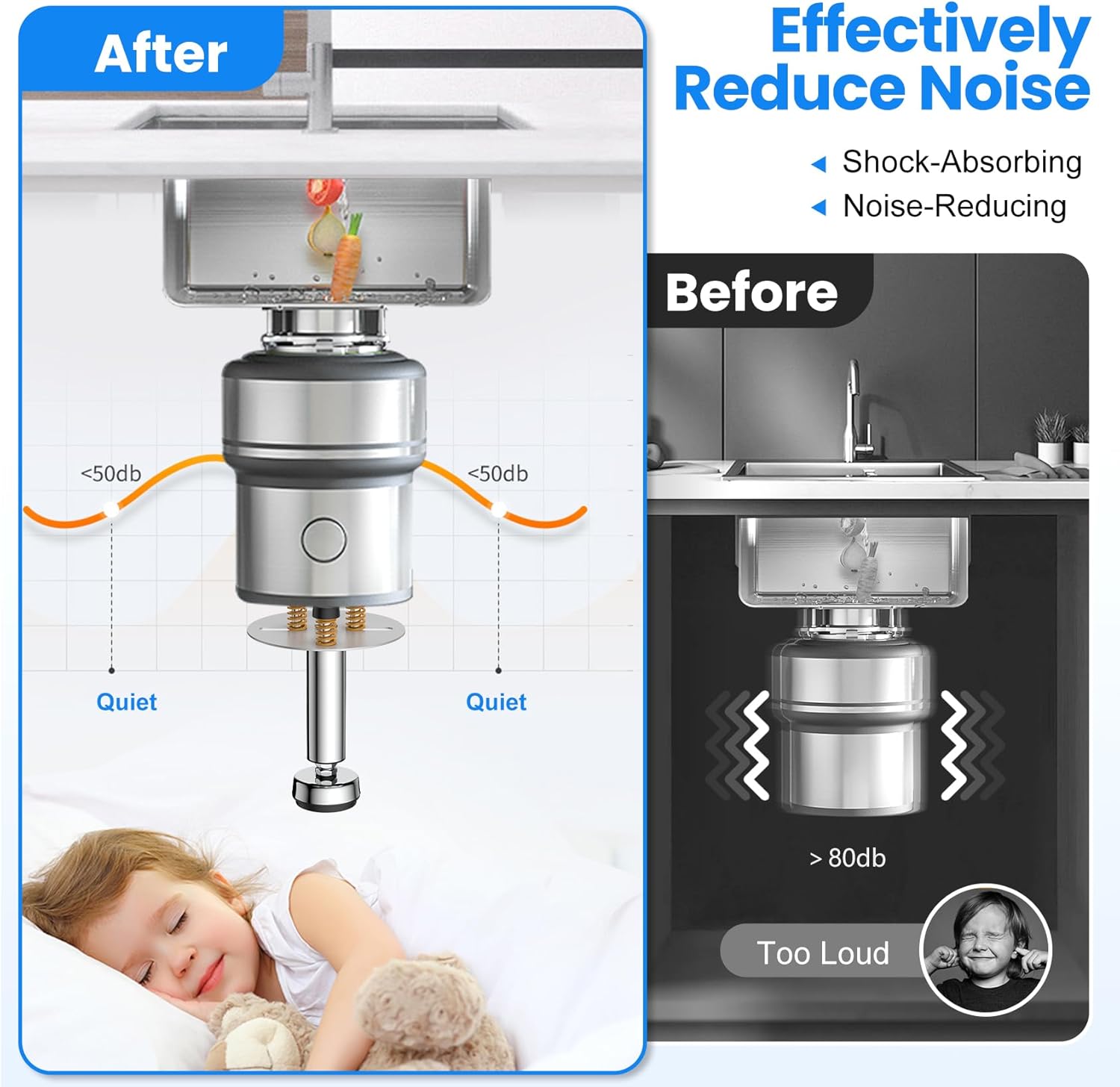 - [4 Moveable Damping Springs] This garbage disposal support is equipped with 4 damping springs, which can effectively reduce the noise caused by the vibration of the garbage disposal and withstand greater weight pressure. The 4 springs can be moved, enlarged or reduced depending on the size of the garbage disposal