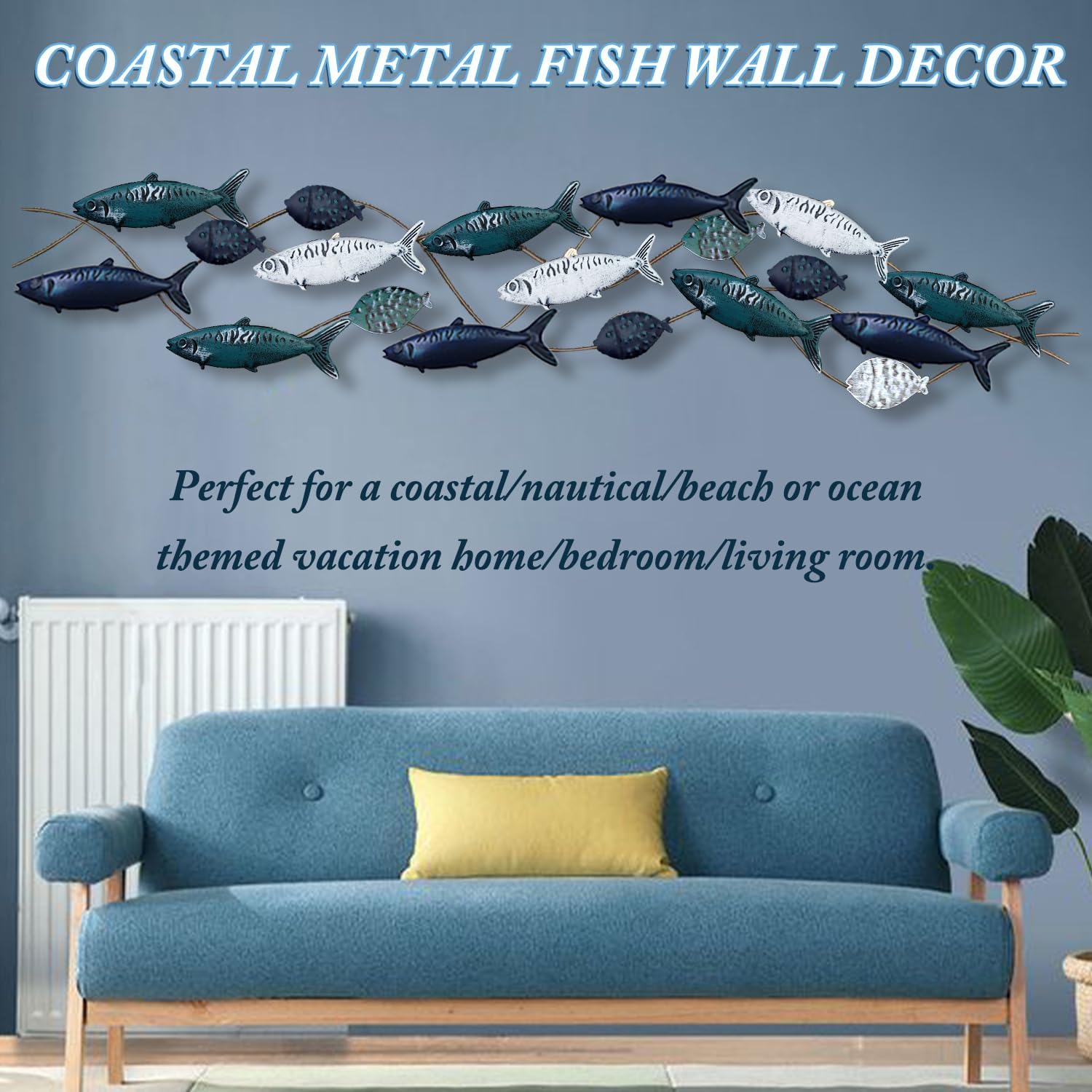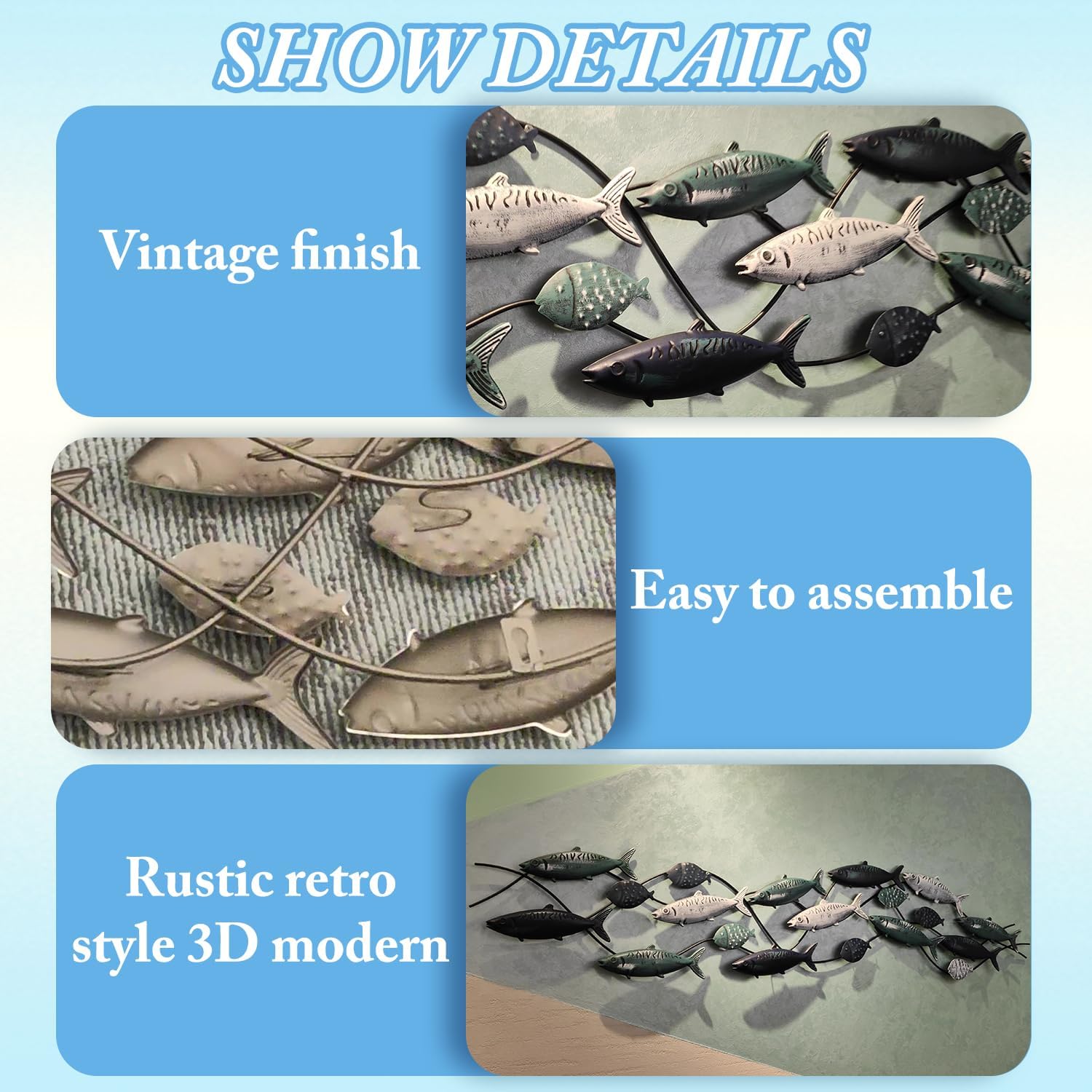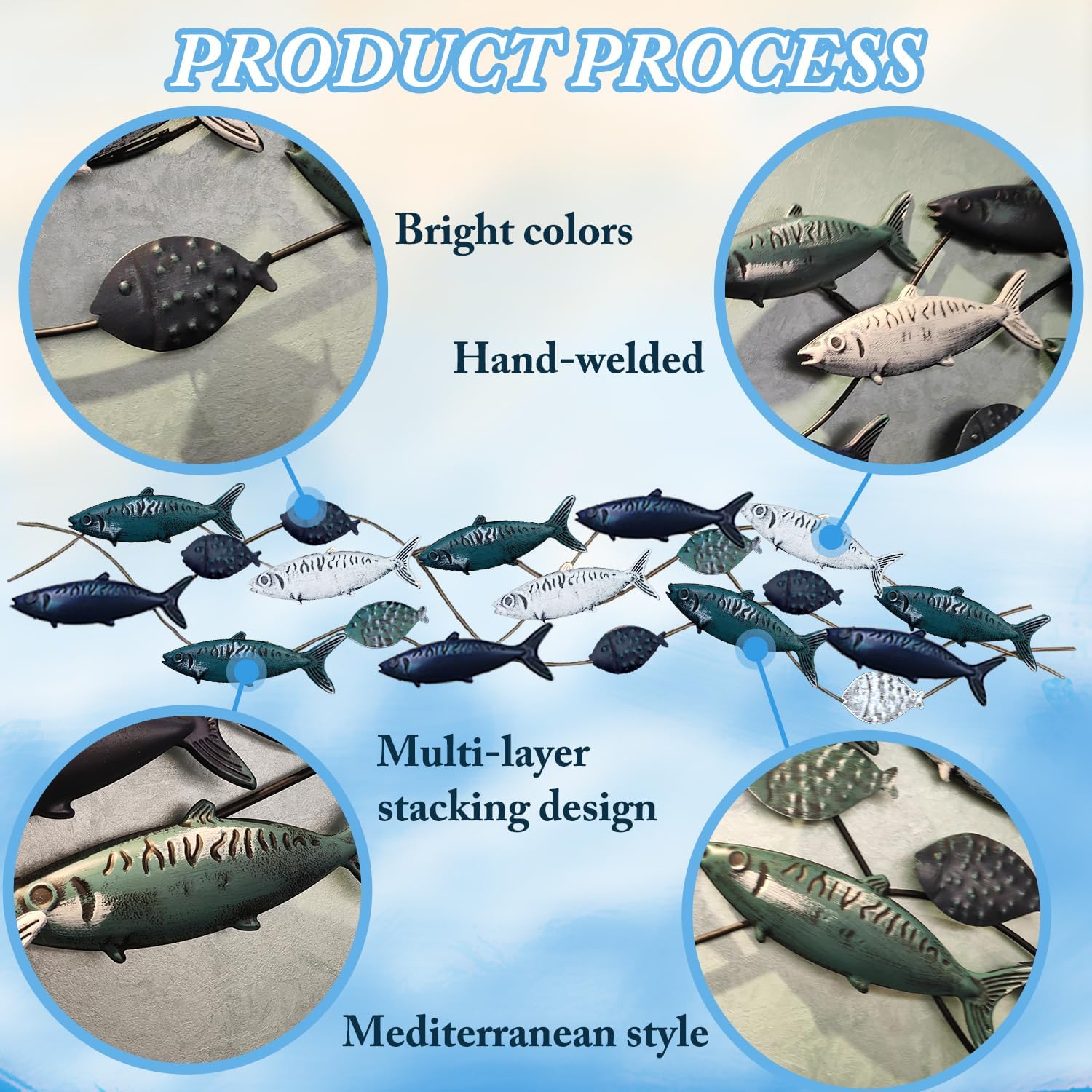 - Metal Fish Wall Décor : 19 lifelike fish frolicking in the water, handmade metal iron crafts, Hand painted old-fashioned fish decoration with a Mediterranean-style marine theme, Smart and elegant, lifelike, retro distressed finish. Large Size 55" x 13"(141 x 34cm).