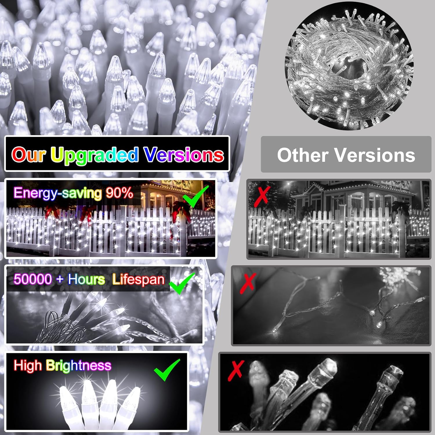 - Weather-Resistant: Crafted to withstand diverse weather conditions, our Christmas lights are resistant to rain, snow, and other outdoor elements, ensuring their durability. The LED features faceted cone lenses for enhanced visibility, making them more beautiful, sturdy, and bright. Besides Christmas, these LED lights can also be utilized for other occasions, such as weddings, parties, or any other festive celebrations, adding a touch of magic and sparkle to any event