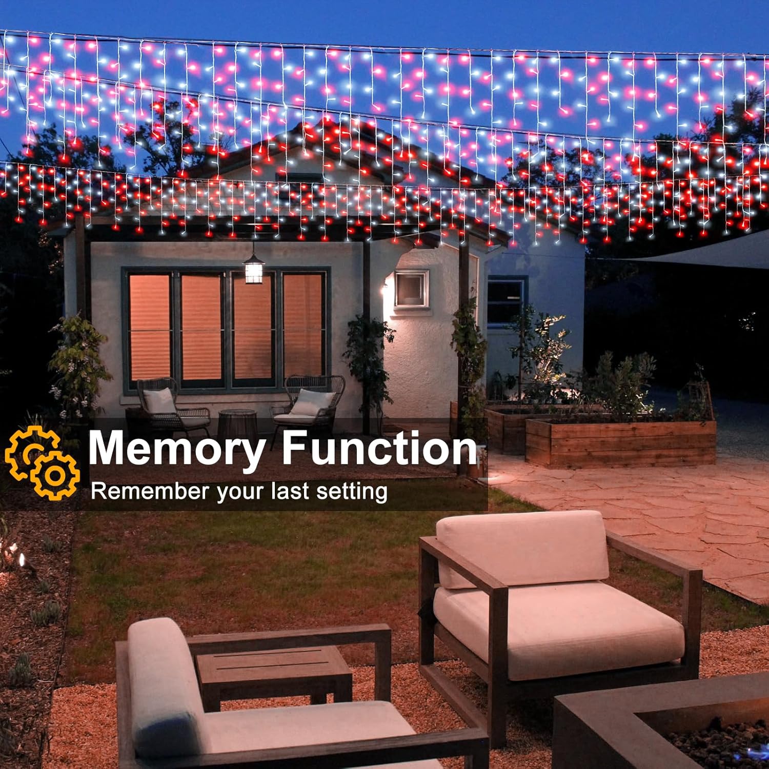 - Memory and Timer Function: The patio lights could recover from the previous setting mode when you restart, no need to reset the mode every time. Press and hold the button on the adapter for 3 seconds until the green light on, then the timer function start, 6 hours on 18 hours off. This smart and convenient icicle Christmas lights outdoor is the best choice for your holiday decoration.