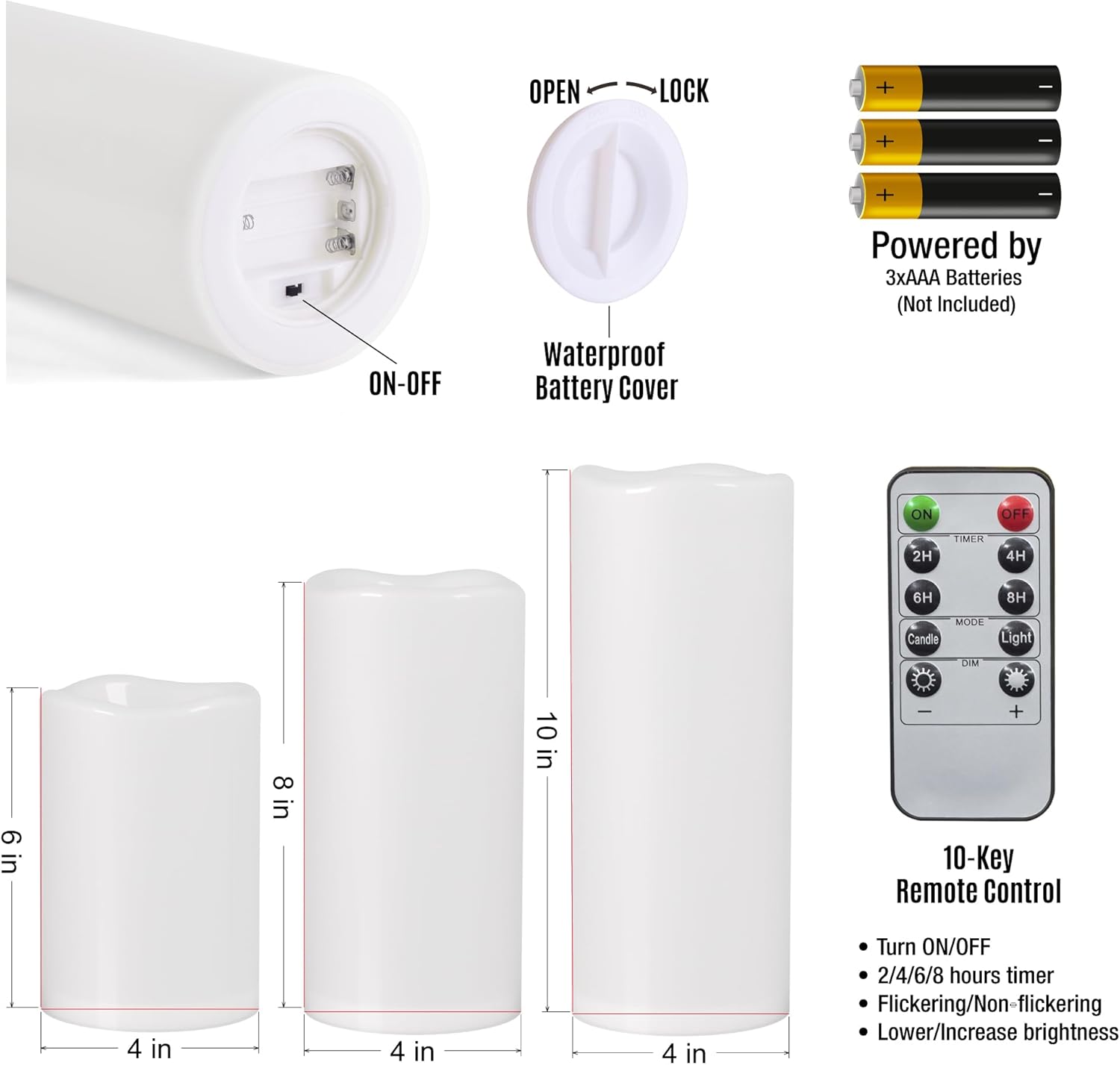 6" 8" 10" x 4" White Large Waterproof Outdoor Flameless Candles Battery Operated LED Flickering Pillar Candles with Remote and Timer for Indoor Outdoor Lanterns, Long Lasting, Set of 3