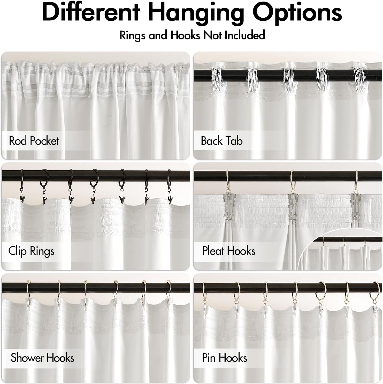- HANGING OPTIONS: Each curtain panel has 3-in-1 top style design: rod pocket, back tab and pinch pleat. Back loop (2.3 inch) and rod pocket (3.1 inch) fit most standard rod. Curtains also can be hung with clip rings or curtain hooks. 3 ways to meet your various needs.