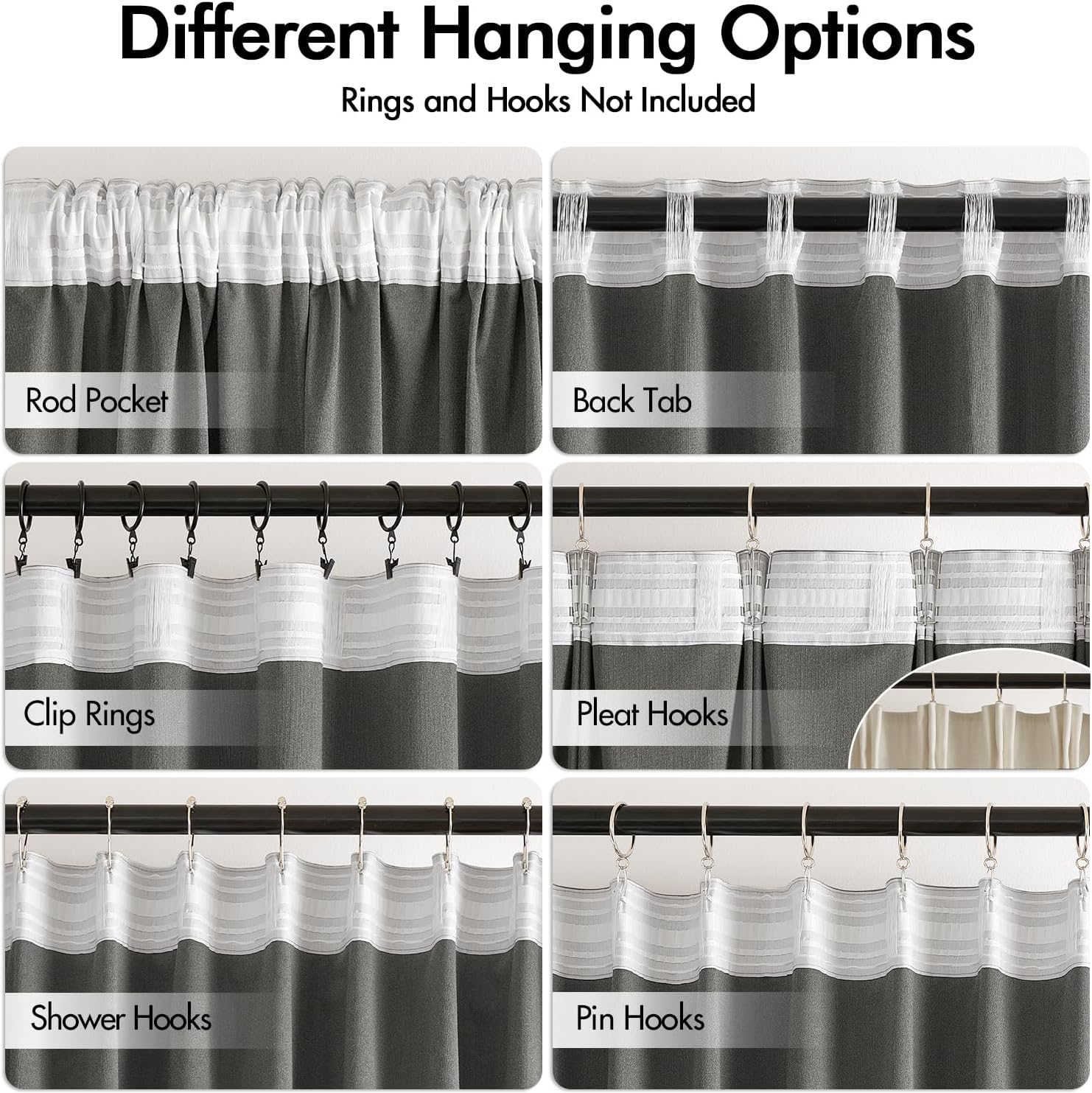 - HANGING OPTIONS: Each curtain panel has 3-in-1 top style design: rod pocket, back tab and pinch pleat. Back loop (2.3 inch) and rod pocket (3.1 inch) fit most standard rod. Curtains also can be hung with clip rings or curtain hooks. 3 ways to meet your various needs.