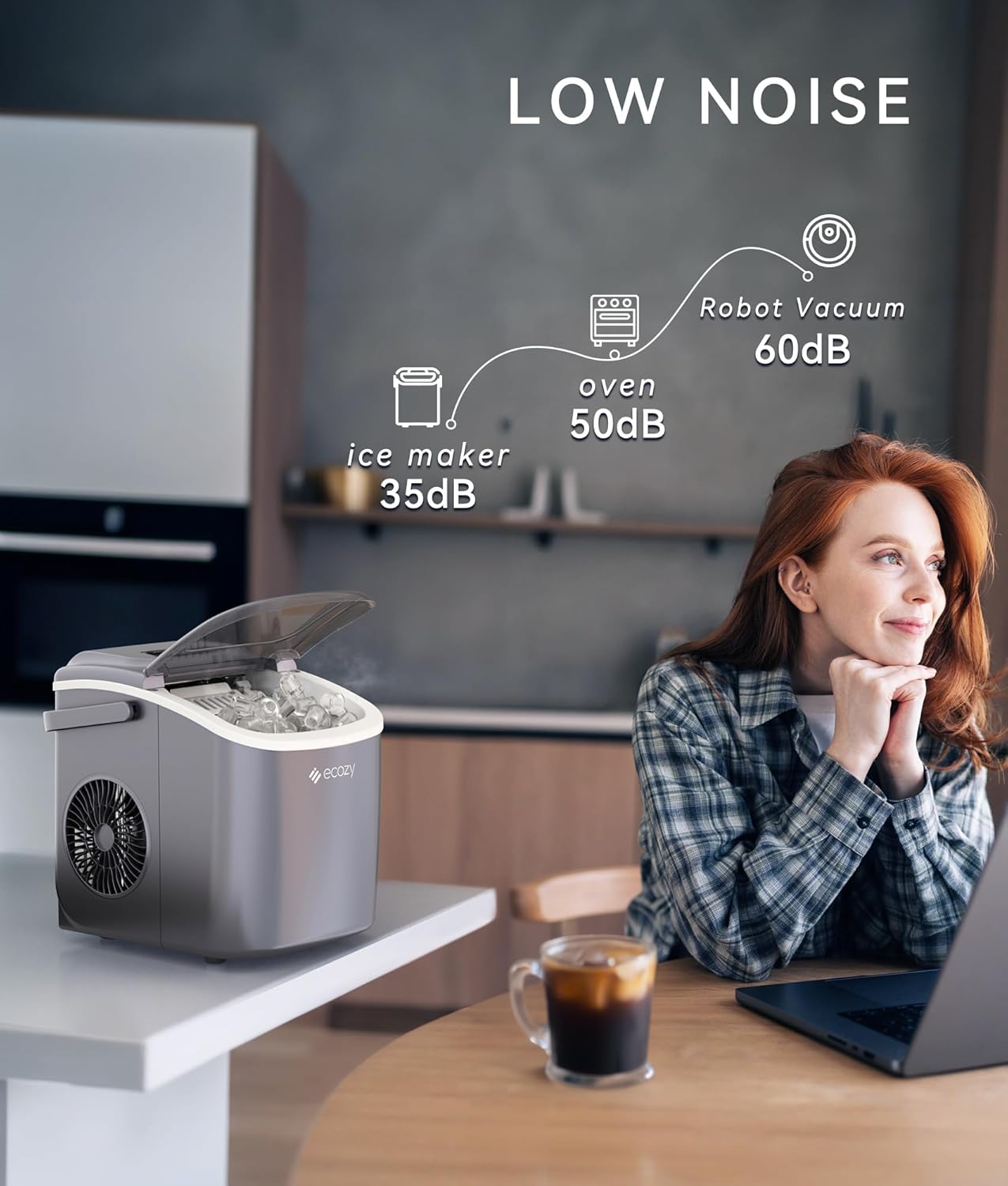 ecozy Portable Ice Maker Countertop, 9 Cubes Ready in 6 Mins, 26lbs in 24Hrs, Self-Cleaning Ice Machine with Handle/Ice Bags/Ice Scoop/Ice Basket, 2 Sizes Bullet Ice for Home Kitchen Office Bar Party