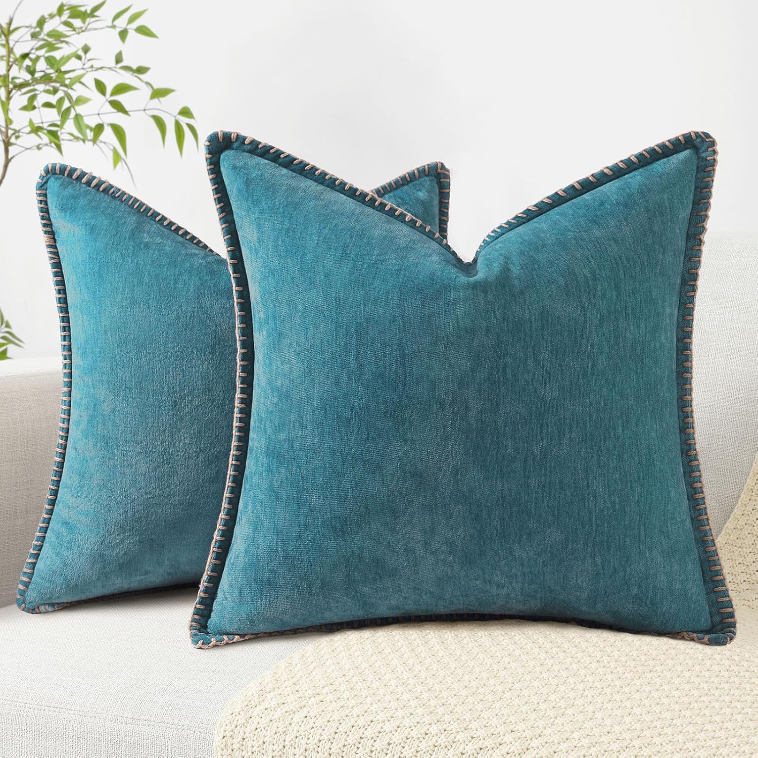 decorUhome Chenille Soft Throw Pillow Covers 20x20 Set of 2, Farmhouse Velvet Neutral Decorative Euro Pillow Covers with Stitched Edge for Couch Sofa Bed Home Decor, Teal