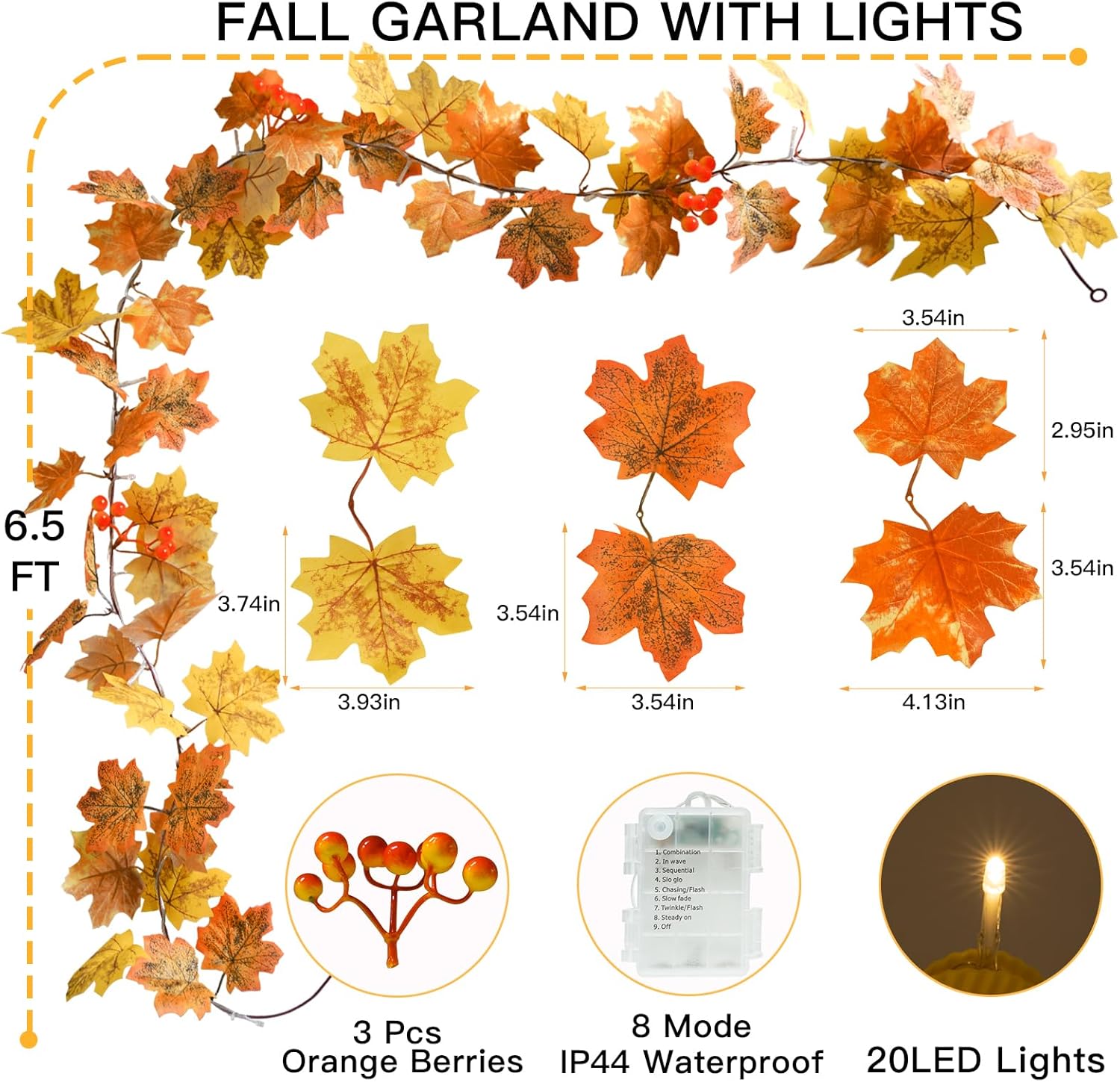 - 🍁Perfect Length for Fall Decorations: Our 6.5-foot garland lights are designed longer than standard (5.83 feet), ideal for mantels and fireplaces. Featuring 20 LED bulbs and realistic maple leaves intricately woven, it enhances indoor and outdoor Fall decor beautifully. (Note: Easily reinstall any fallen maple leaves or berries.)