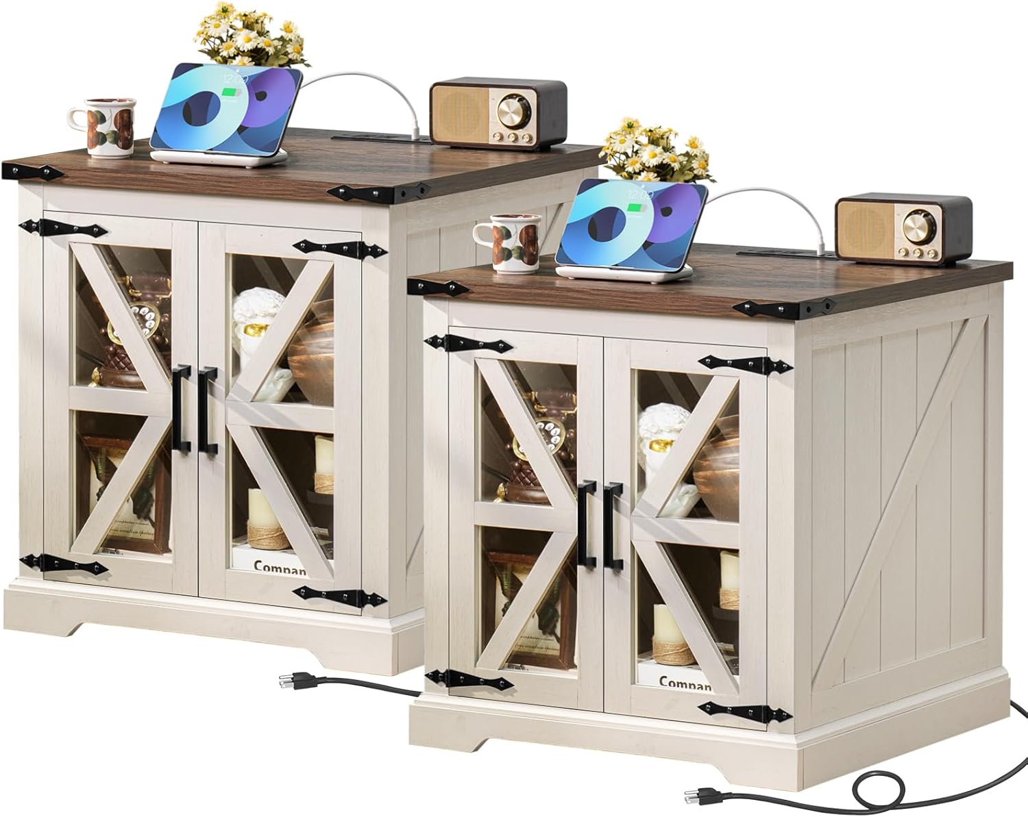 - 🏡[Farmhouse-Style end Table with Charging Station]This large end tables with generous storage is a perfect fusion of farmhouse and industrial metal styles. The exquisite barn-style tempered glass doors and the black metal corner accents add an elegant touch to the cabinet body, making it visually captivating from any angle.