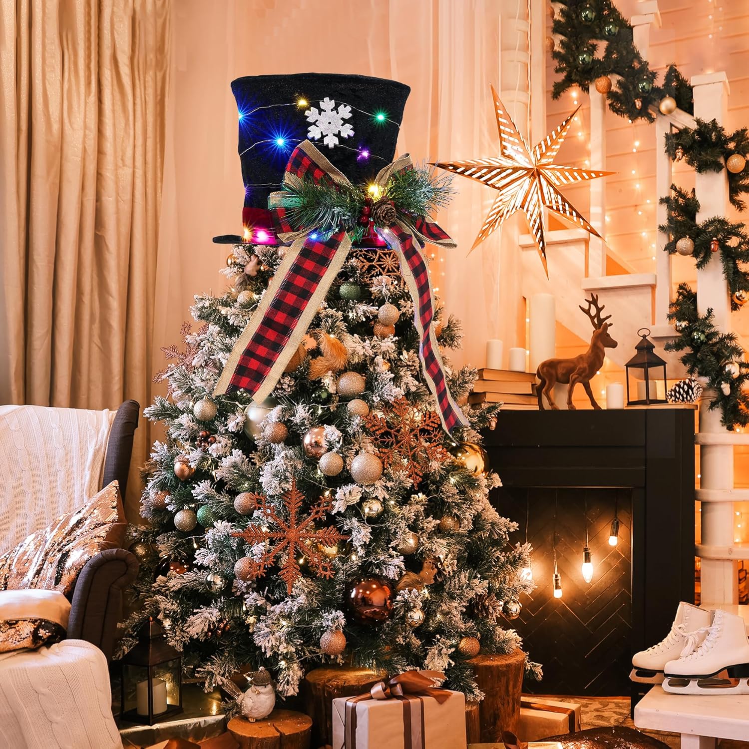 - 【Pretty Bling Christmas Tree Top Hat】: This top hat is not just an ordinary tree topper; it's a dazzling spectacle with built-in glowing that cast a warm and inviting glow. This luxurious top hat is made from a blend of soft velvet, polyester, and plush materials, coupled with metal accents. Its sophisticated design and intricate details make it a standout piece, adding a touch of elegance to your winter celebrations throughout the season.