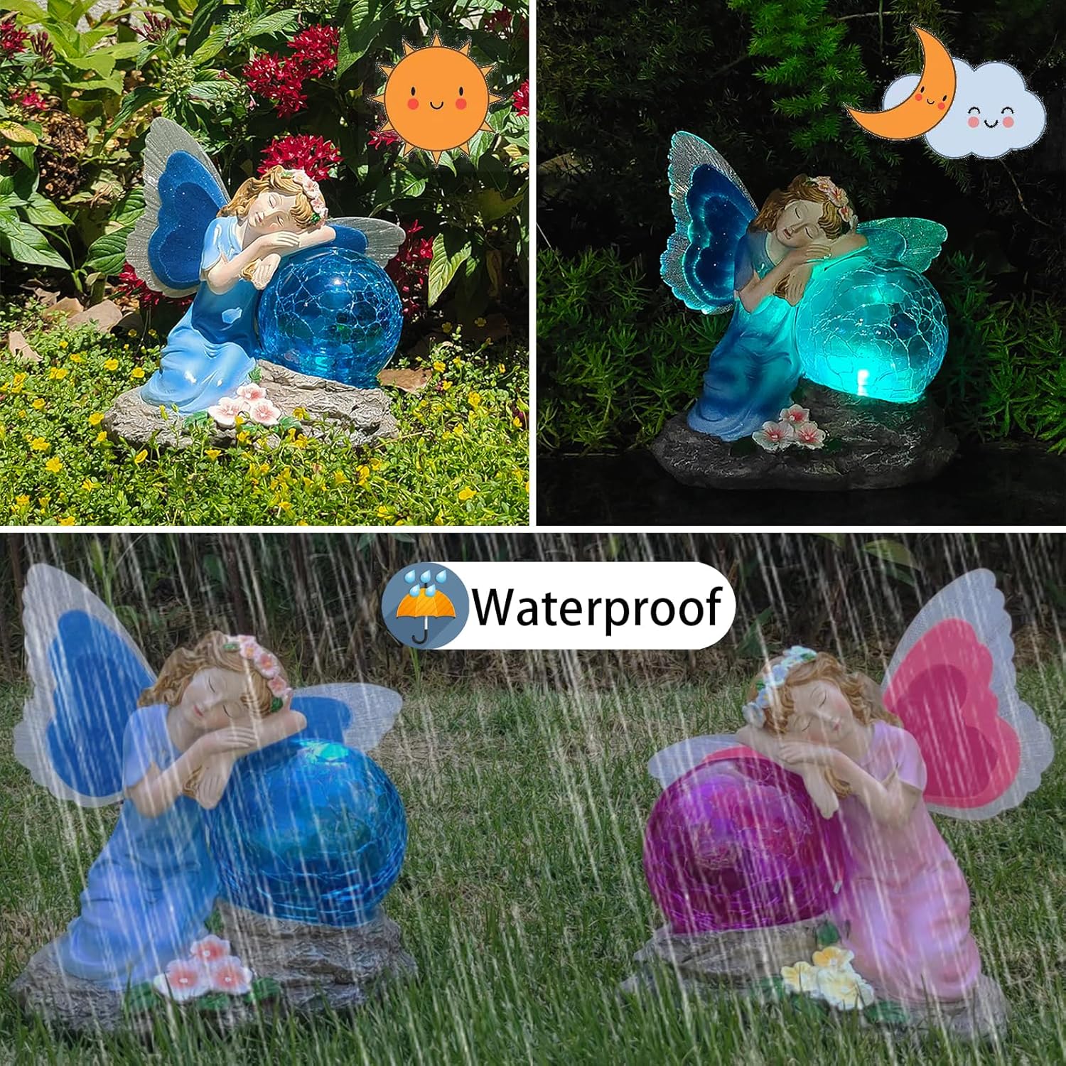 - Enhance your outdoor and garden with enchanting solar fairy decor. Wings and glass spheres glow with colorful colors at night! perfect for garden ornaments for outside garden and fairy garden accessories outdoor.