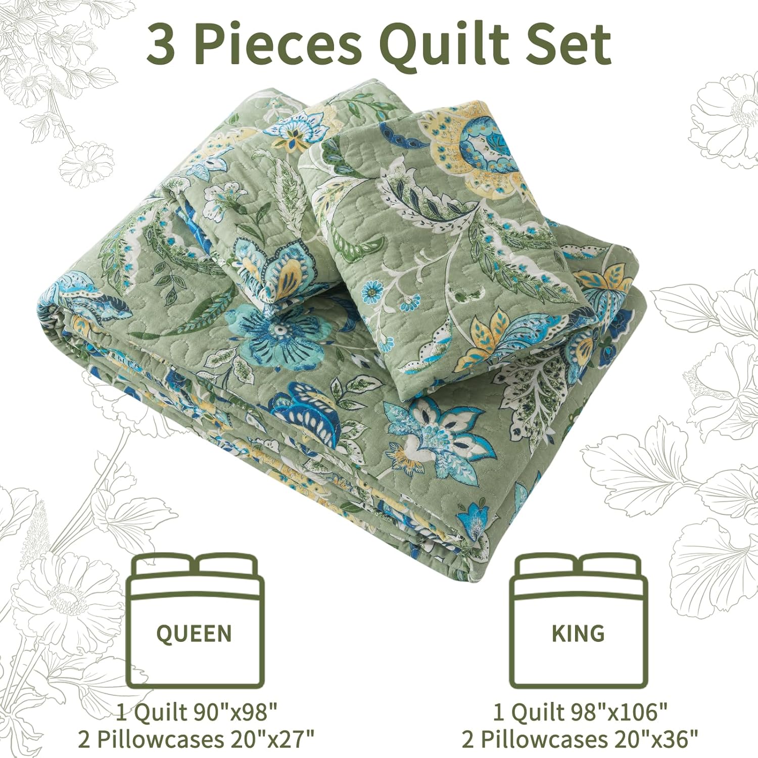 VAPUTAR King Quilt Bedding Set - Cotton Bedspreads King Size (98 x 106 inch) with Floral Pattern, Farmhouse Lightweight King Size Quilt Suitable for All Season(3 Pieces, Olive Green)