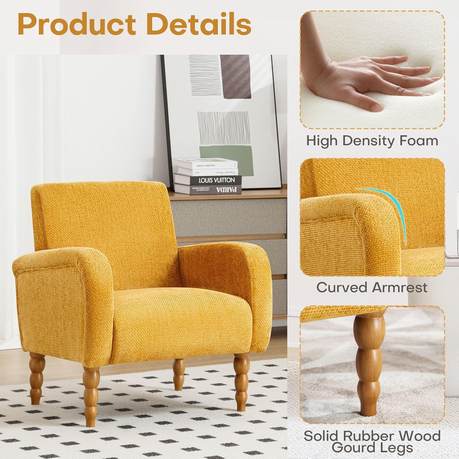 - 【Choose Your Material】These upholstered accent chairs come in two luxurious options: a premium chenille fabric or polyester blend with a knitted jacquard texture. The polyester blend is known for its durability and resistance to wear, ideal for high-traffic areas. The chenille fabric offers a soft, plush feel and elegant appearance, adding sophistication to any room. Both materials provide excellent breathability and comfort, ensuring an exceptional seating experience.