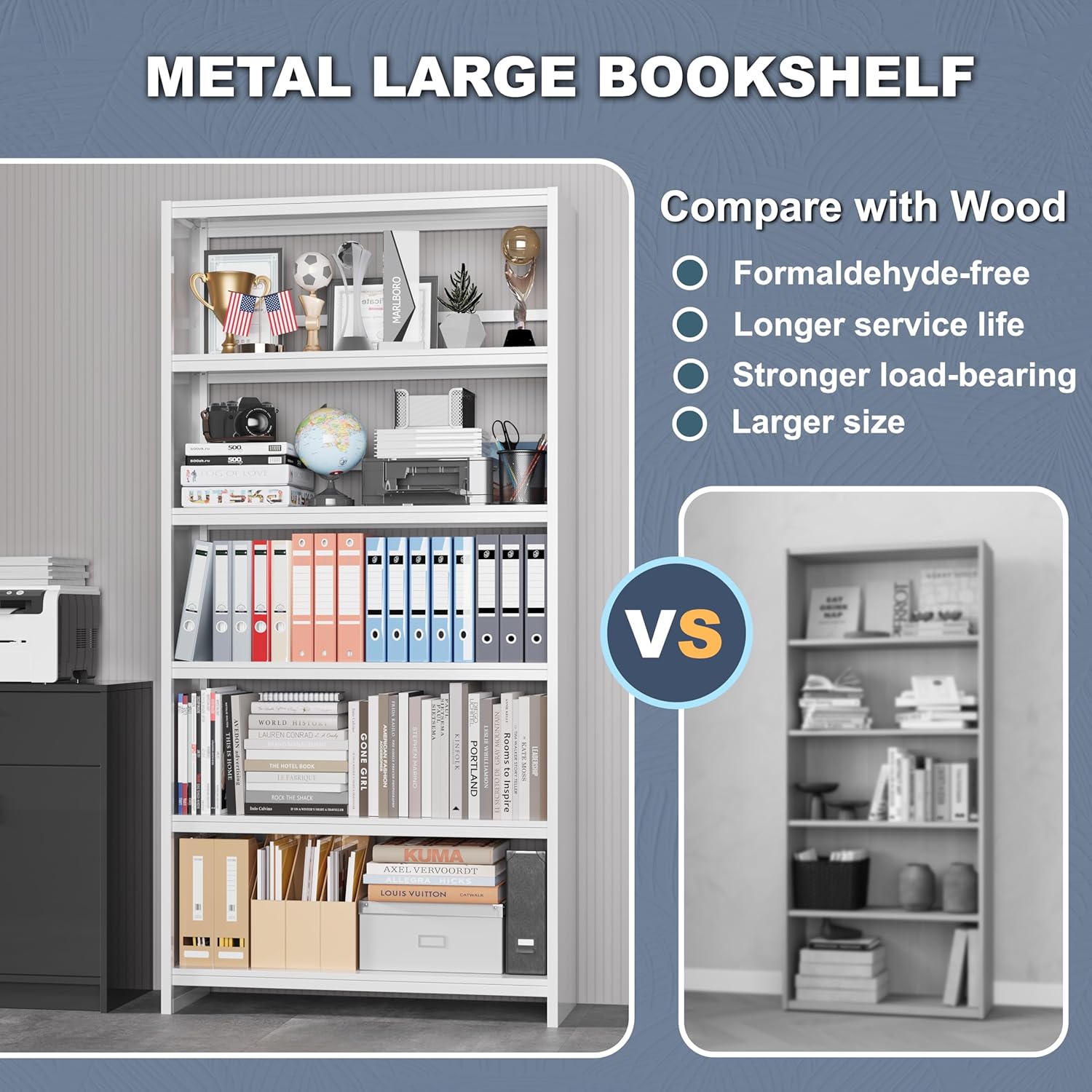 - ăMetal Frame BookshelfăStable, firm, and total 750lbs load-bearing. 69"Tall library bookshelf adopts an integrated cold-rolled steel welding structure, 5-tier adjustable layer board will not deform when filled with books. The standing frame of the wide library bookshelf can keep stability when filled with books.