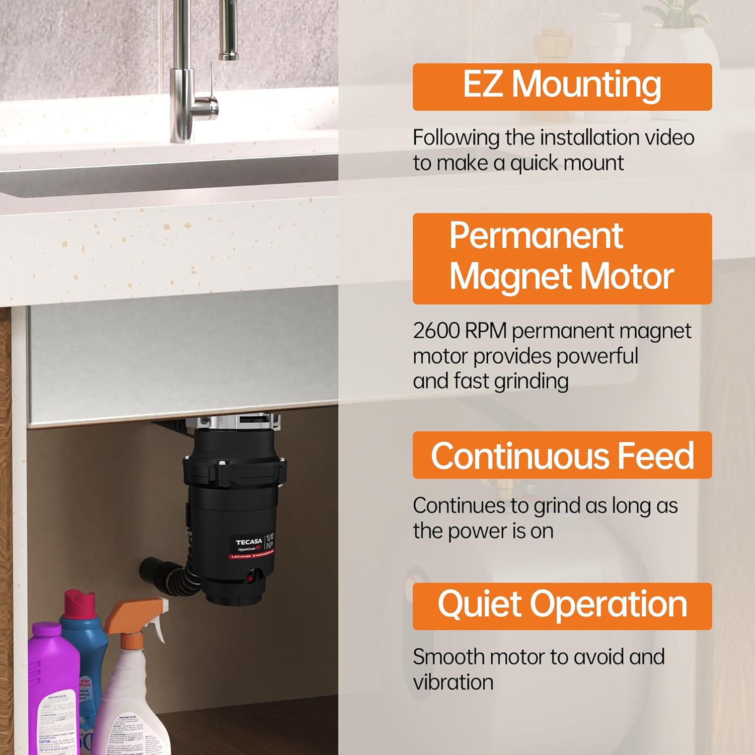 - SIMPLE INSTALLATION: The sink disposal features a compact size and mount design that fits most existing EZ mounting assemblies, making it easy and fast to install or replace. It's compatible with other popular brands.TECASA garbage disposal is suitable for most home kitchens for standard 3-1/2 inch sink opening hole. A pre-installed 39" power cord for electricity connection.