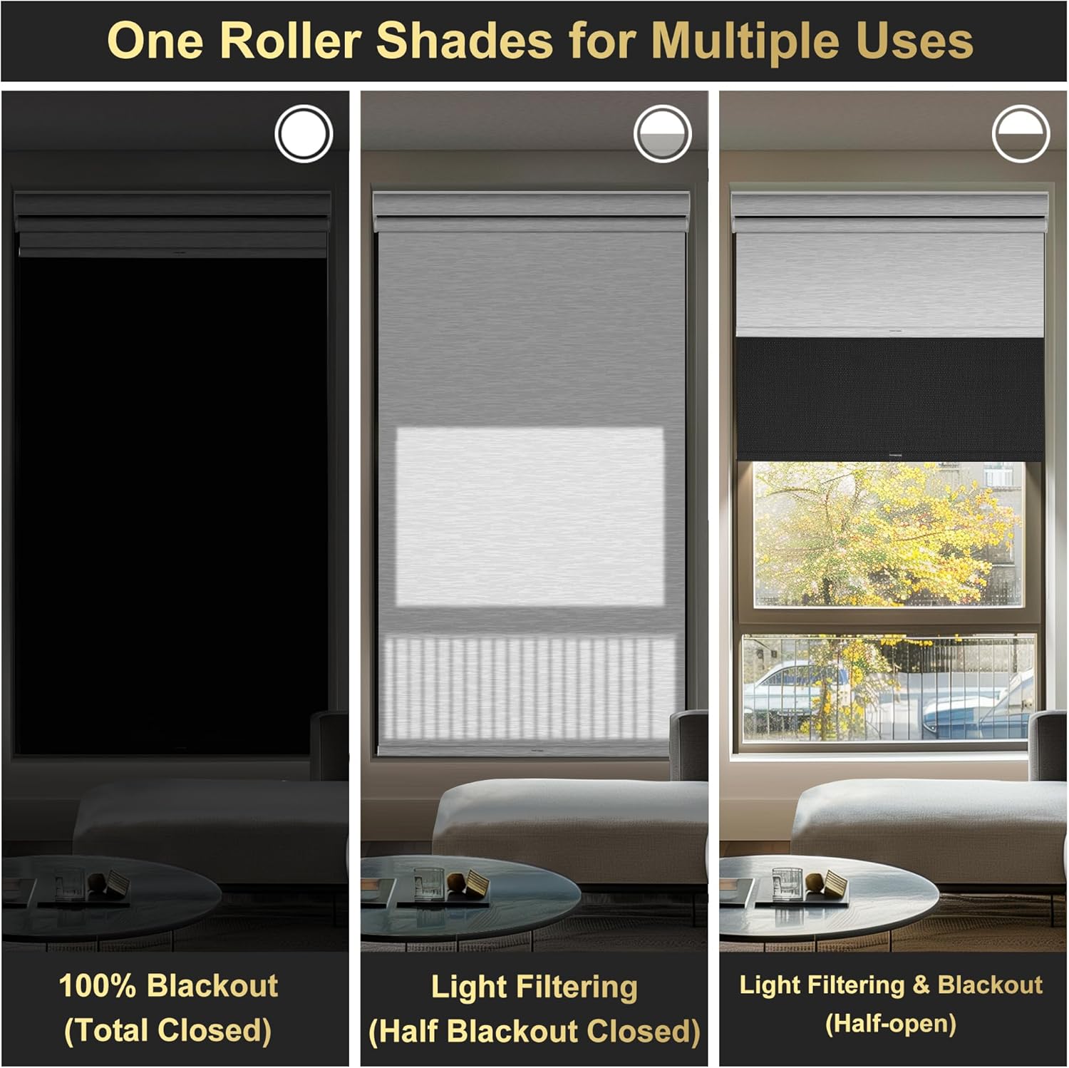 - MULTI-PURPOSE SHADE:Dual roller shades consisting of blackout and light filtering shades, blackout roller shade can 100% blackout,thermal insulation and UV Protection,so that you can experience quiet and comfort of the night during daytime;Light filtering roller shade allow light to filter into your room,and no glare,soft diffused light allow for perfect balance of light and darkness,and also enhances overall aesthetics of your home,allowing for a romantic and comfortable living environment.
