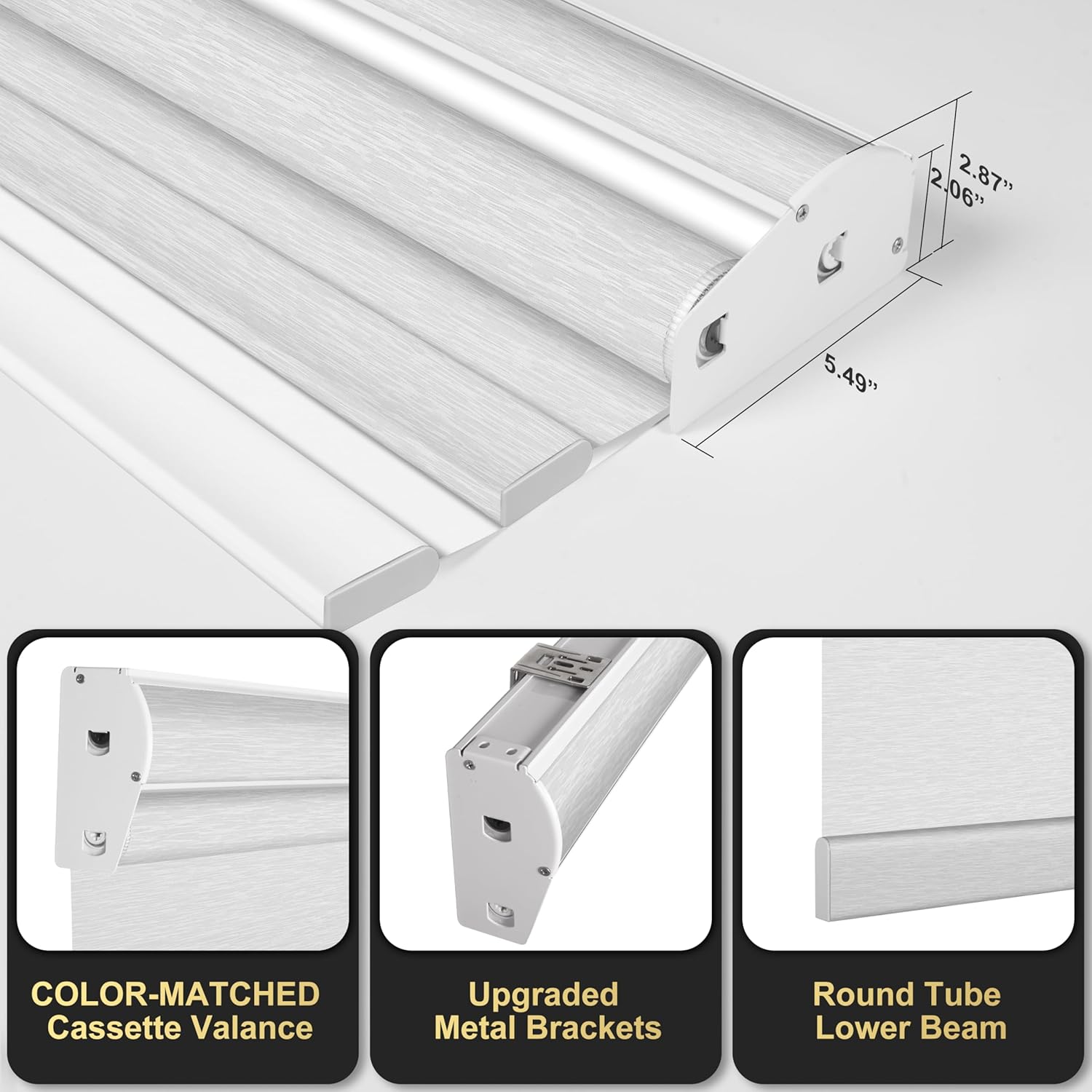- FREE STOP CORDLESS SYSTEMïŒThe cordless double roller shade prioritizes safety with a cordless design designed for families with small children or pets.You just need to pull down or push up to stop at any position you want. COLOR-MATCHED CASSETTE VALANCEïŒThe hidden installation of the cordless roller blinds can effectively reduce installation gaps, reduce light leakage.The color of the cassette valance is same as the fabric color,making the day night blinds more beautiful after installation.