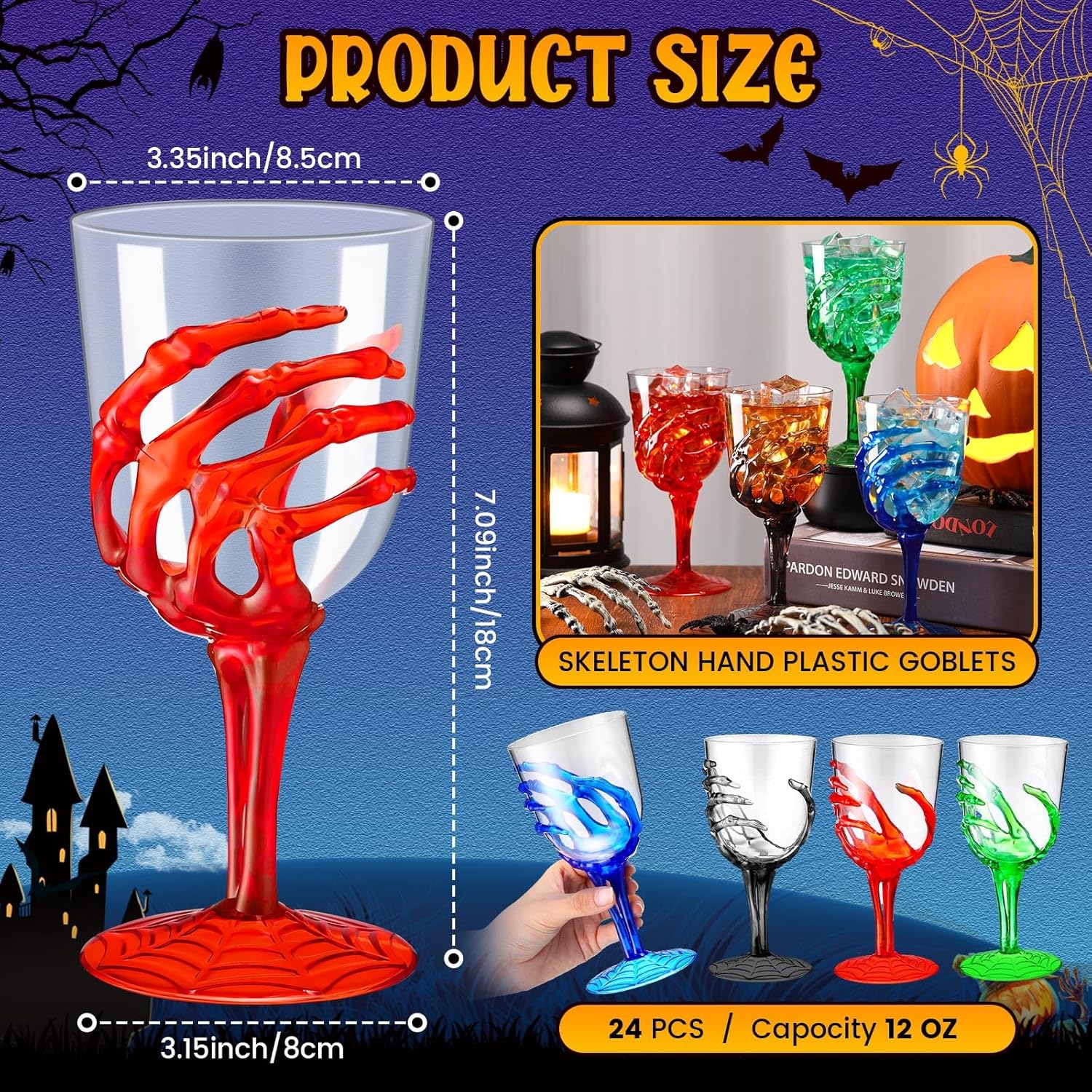 Sliner 24 Pcs Halloween Skeleton Hand Plastic Goblets 12 oz Spooky Skeleton Hand Goblets Halloween Wine Glasses Champagne Glassware Creepy Clear Cups for Party Haunted House, 4 Color