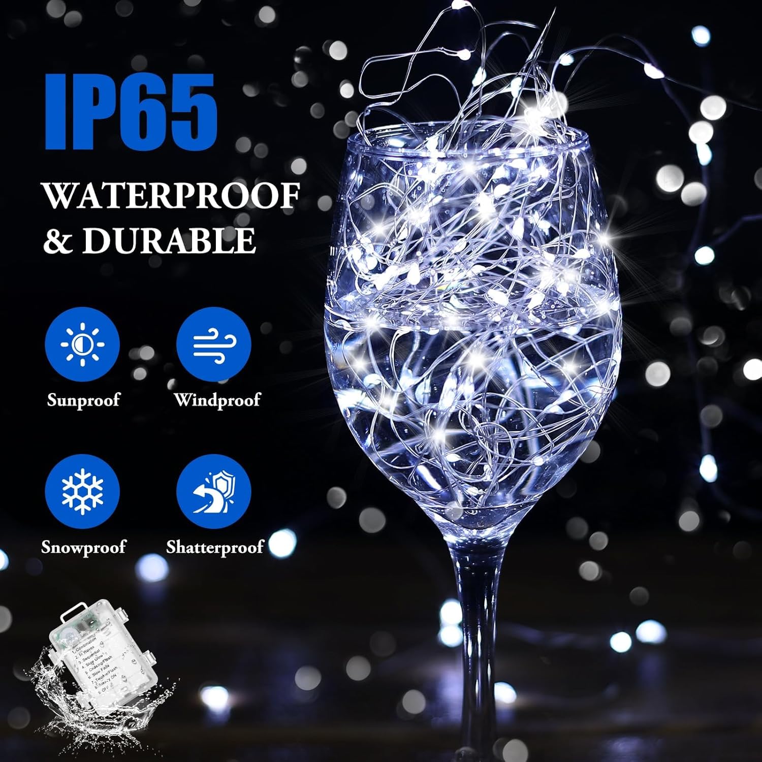 - Waterproof for All Weather Use: The battery operated string lights feature IP65 waterproofing, while the compact battery box is rated IP44 with a waterproof seal, making it ideal for outdoor use in any weather condition