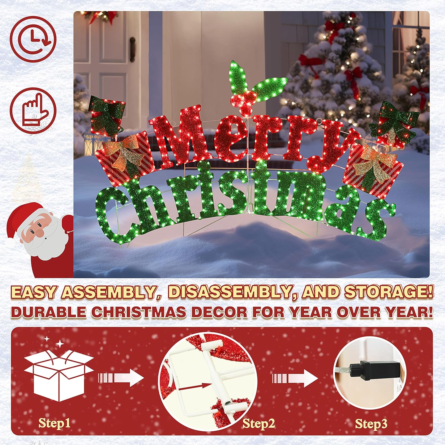 - Easy to Assembly: It only takes 3 steps to assembly. Step 1: Take out all the items from the package. Step 2: Assemble it according to the instructions. Step 3: Plug in the socket to light it up. If you are going to use this Merry Christmas sign on the ground, don’ t forget the ground stakes included that will make it well fixed