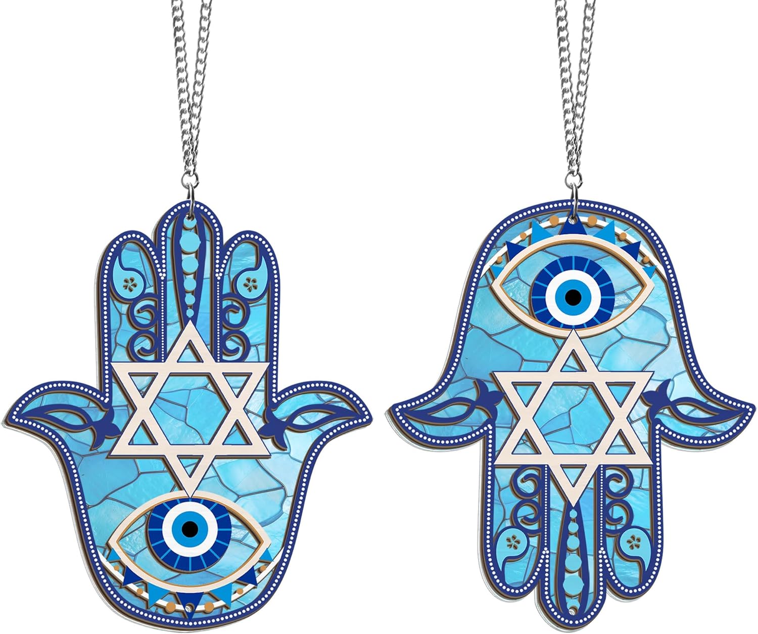 - HANUKKAH GIFTS FOR WOMEN, MEN – Celebrate the profound symbolism of the Hamsa protection amulet with our exquisite suncatchers for windows hanging. Adorned with the Star of David and Blue Evil Eye design, these house warming gifts for men, women, good luck gifts for mom, friends bring a serene touch of Hanukkah and Jewish spirit to your room, wall decor.