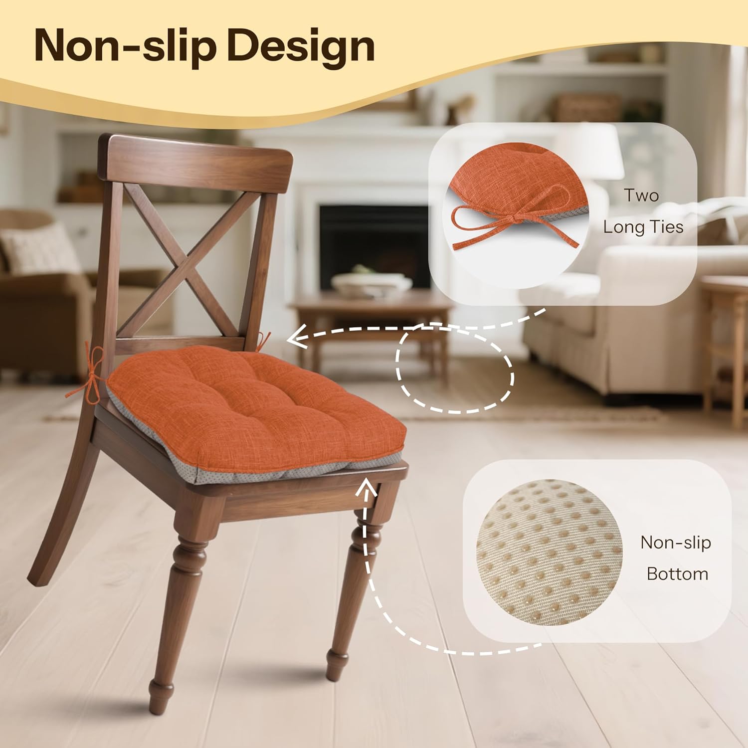- Non-Slip Design: Designed with 33cm/13-inch straps and a non-slip backing, these chair pads won't slip or slide off your chair. They're easy to attach and non slip silicone bottom can prevent the dining room chair cushions from sliding around.
