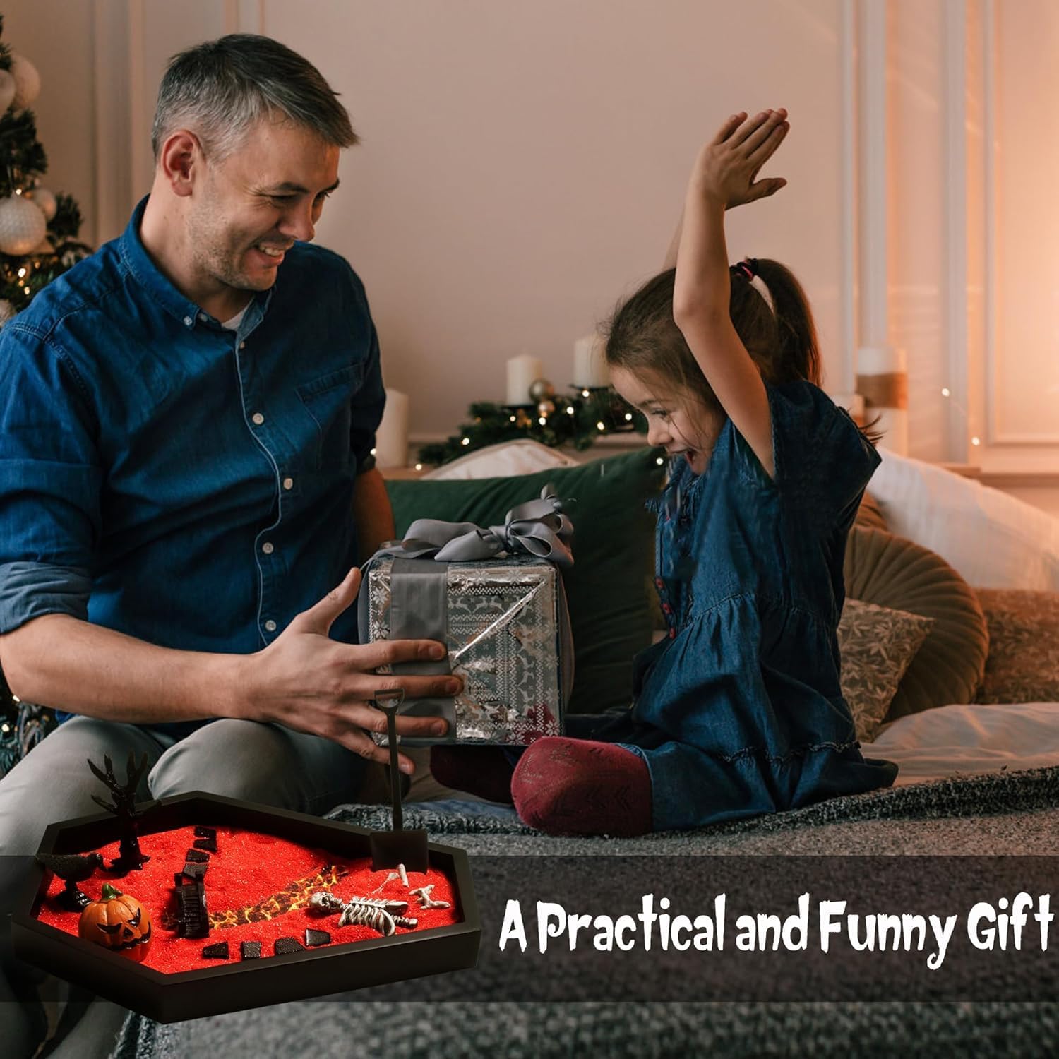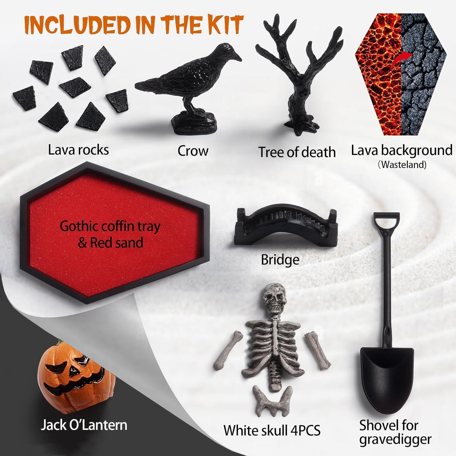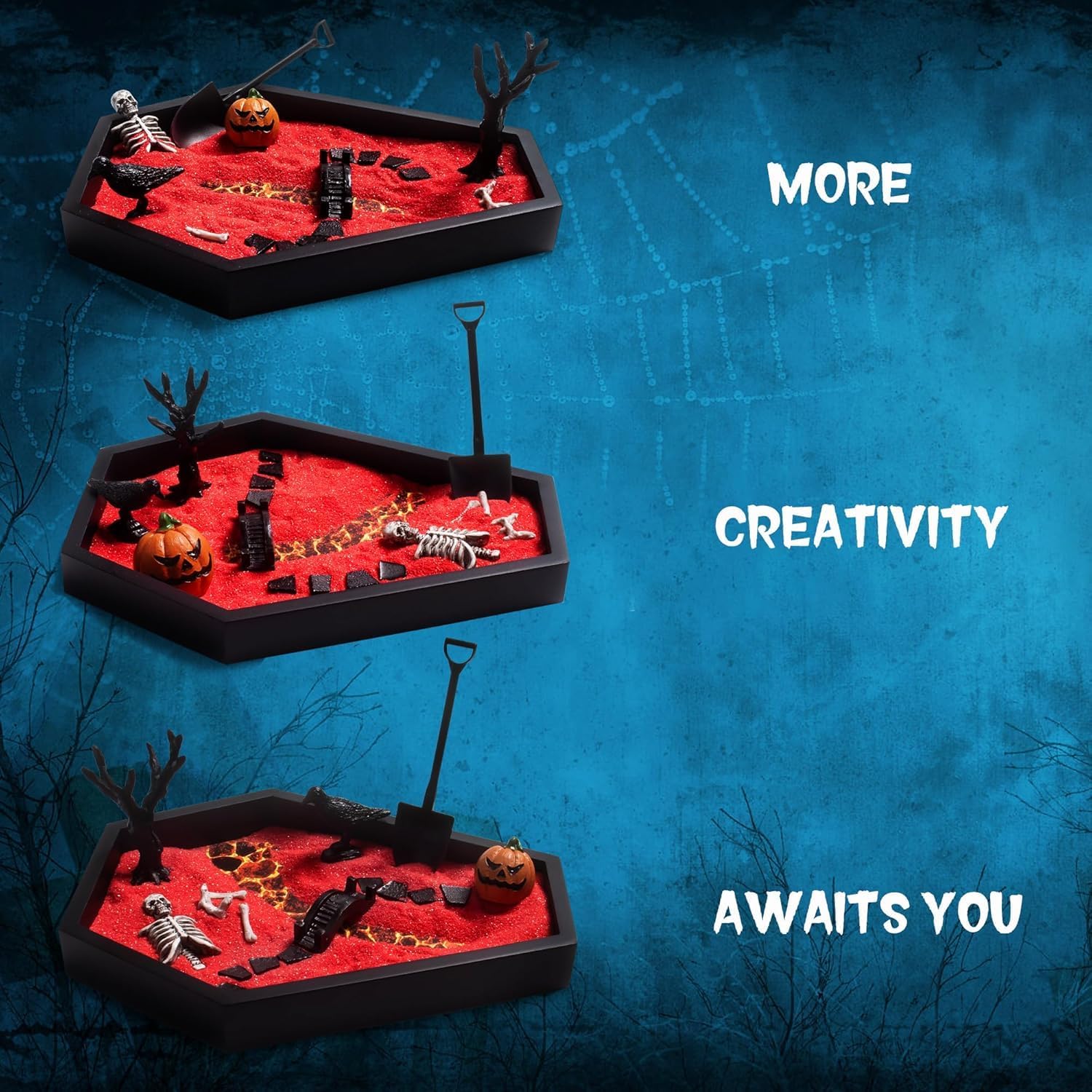 - 💀 DIY: Our Halloween Coffin Zen Garden is designed to resemble a traditional coffin.This product has 9 accessories including 1 Gothic coffin tray, 1 bridge, 1 bag of red sand, several pieces of molten rock, crows, a shovel, a dead tree, a half skeleton, and a base image of molten rock. On the special holiday of Halloween, you can place your imagined hell world, the intersection of life and death, and so on in any corner of your home to present the atmosphere of Halloween you want. Any artistic conception you want to express can be created by yourself.