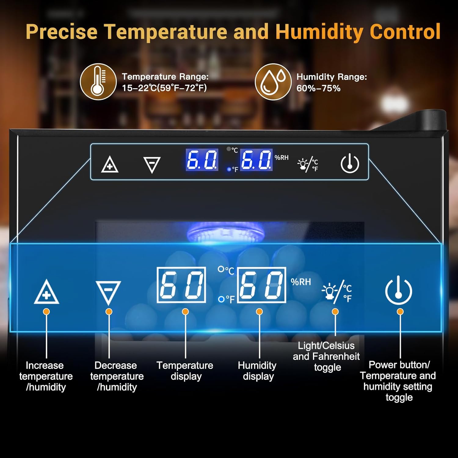 - Precision at Your Fingertips: Take charge with touch-controlled temperature and humidity settings, maintaining interior climates between 15-22°C (59-72°F) and humidity levels ranging from 60% to 75%.