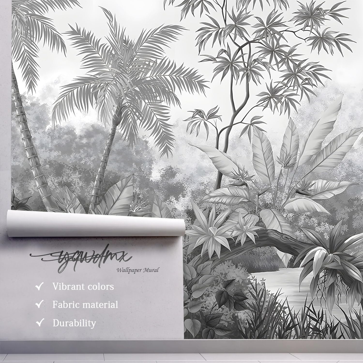 -Grey Rainforest Leaves Fabric Wallpaper Bedroom XT11 M 140" x 91"