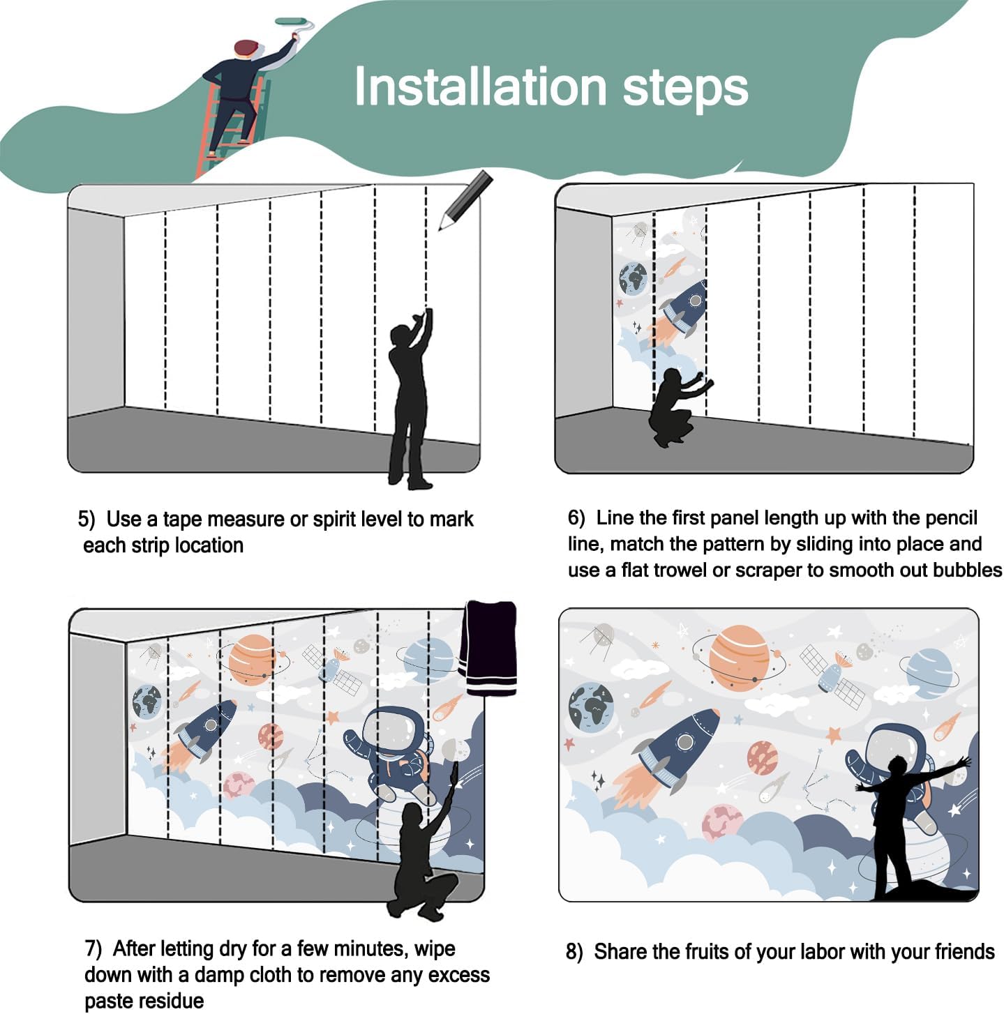 - Mural wallpaper size: 140 "W x 91 "H, divided into 7 sections, each section is labeled with a number underneath, there is no need to overlap the pattern when installing, just install according to the number labeled underneath the panel