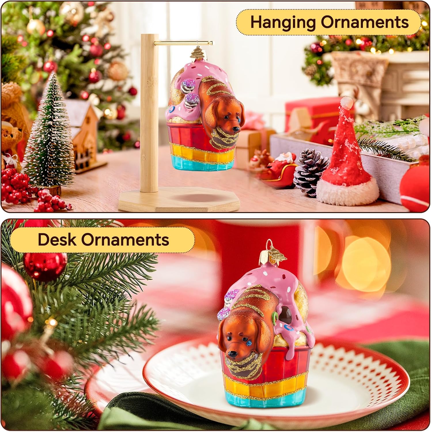 Dog Christmas Tree Ornaments,Hand-Blown Glass Ornaments,Cupcake Collection Figurine Hanging Ornaments,Dachshund Dog Christmas Ornament for Animal Lovers Party Holiday Home Decorations Gifts