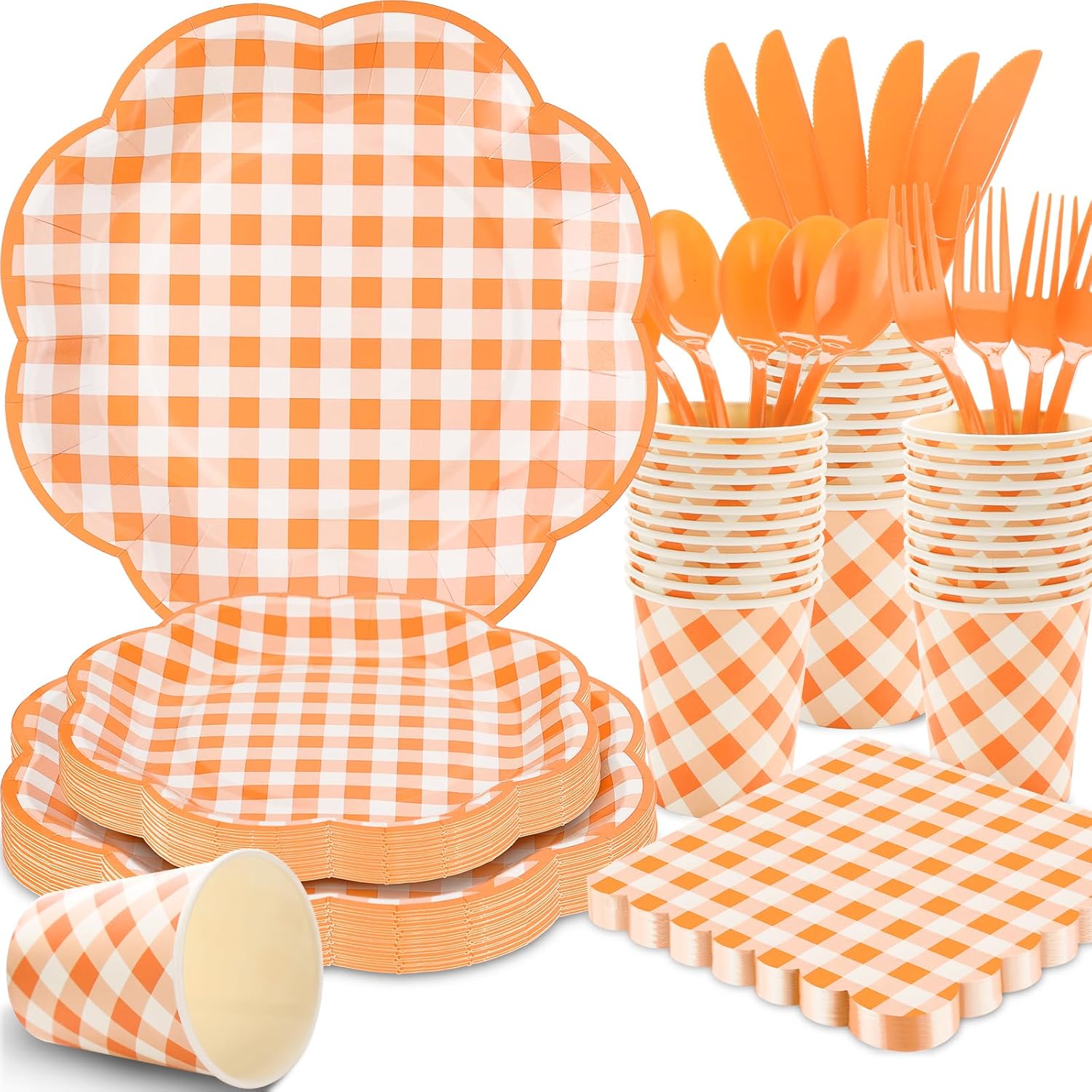 - ăServes 25 GuestsăOrange gingham party supplies includes 25pcs 9-inch orange checkered dinner plates, 25pcs 7-inch orange plaid dessert plates, 25pcs 9 oz gingham cups, 25pcs 6.5-inch orange gingham napkins, and 25 sets of knives, forks, spoons for a total of 175 pieces. Perfect for all kinds of parties and celebrations