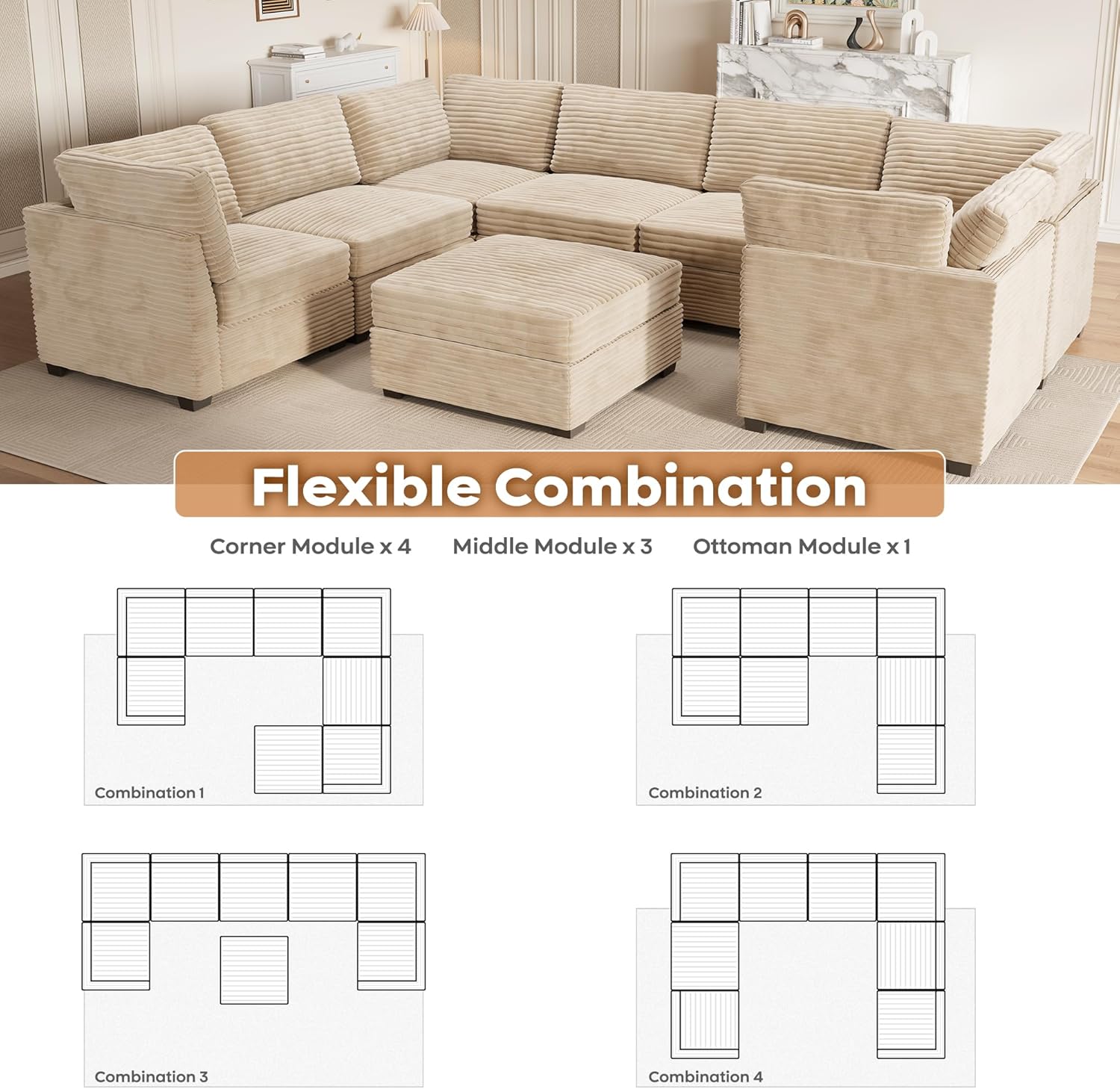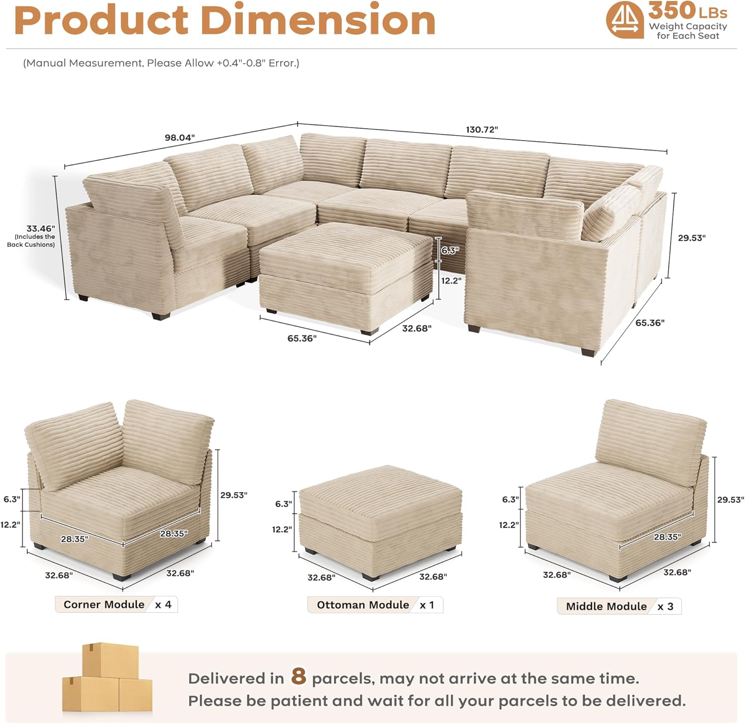 ovios Sectional Sofa Couch with U-Shape Chaise Sofa Bed, Comfy Modular Cloud Couches with Deep Seat, Modern Upholstered Plush Corduroy Sofas Set for Living Room, 8-Seater, Beige