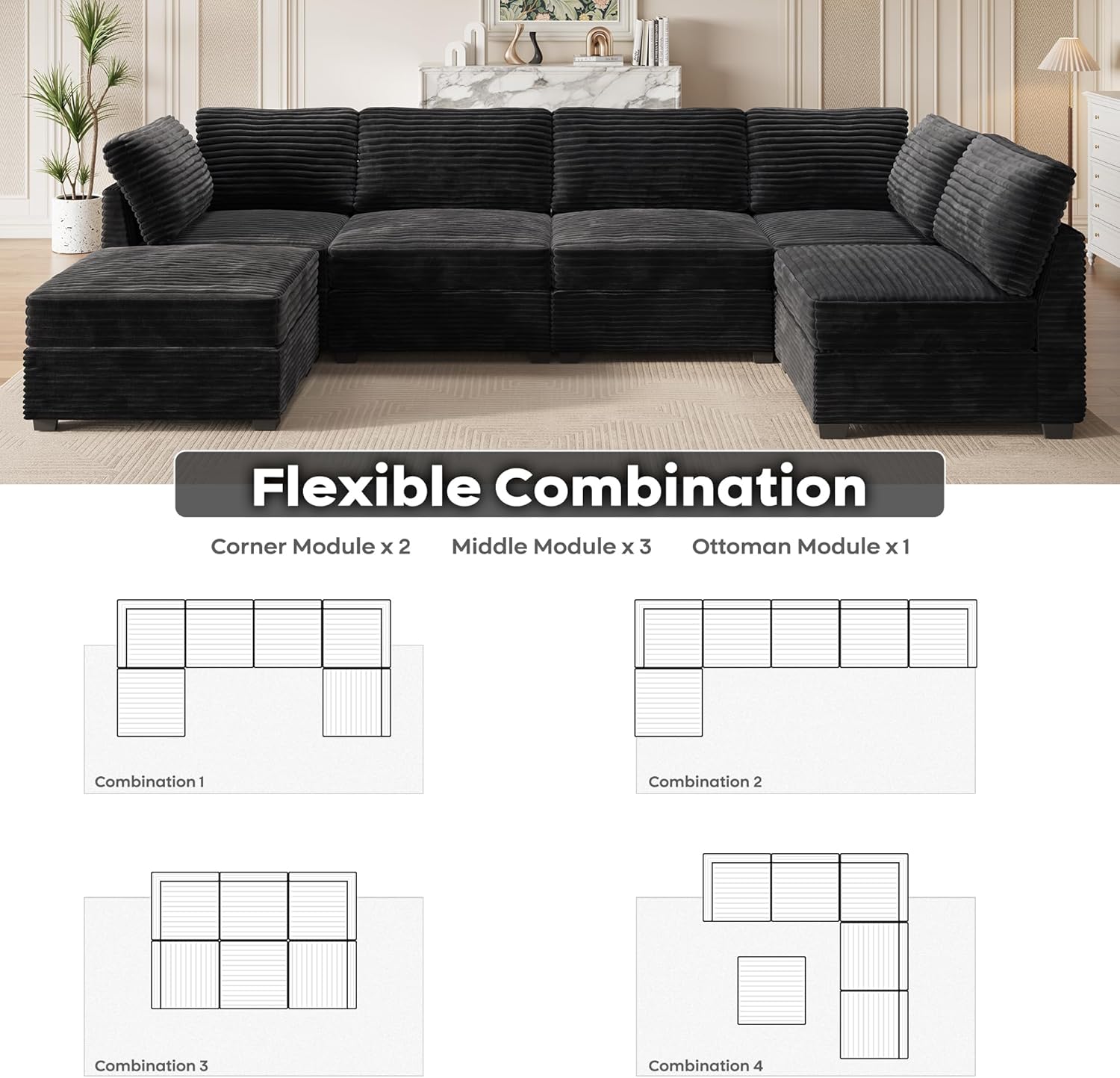 ovios Sectional Sofa Couch with U-Shape Chaise Sofa Bed, Comfy Modular Cloud Couches with Deep Seat, Modern Upholstered Plush Corduroy Sofas Set for Living Room, 6-Seater, Black