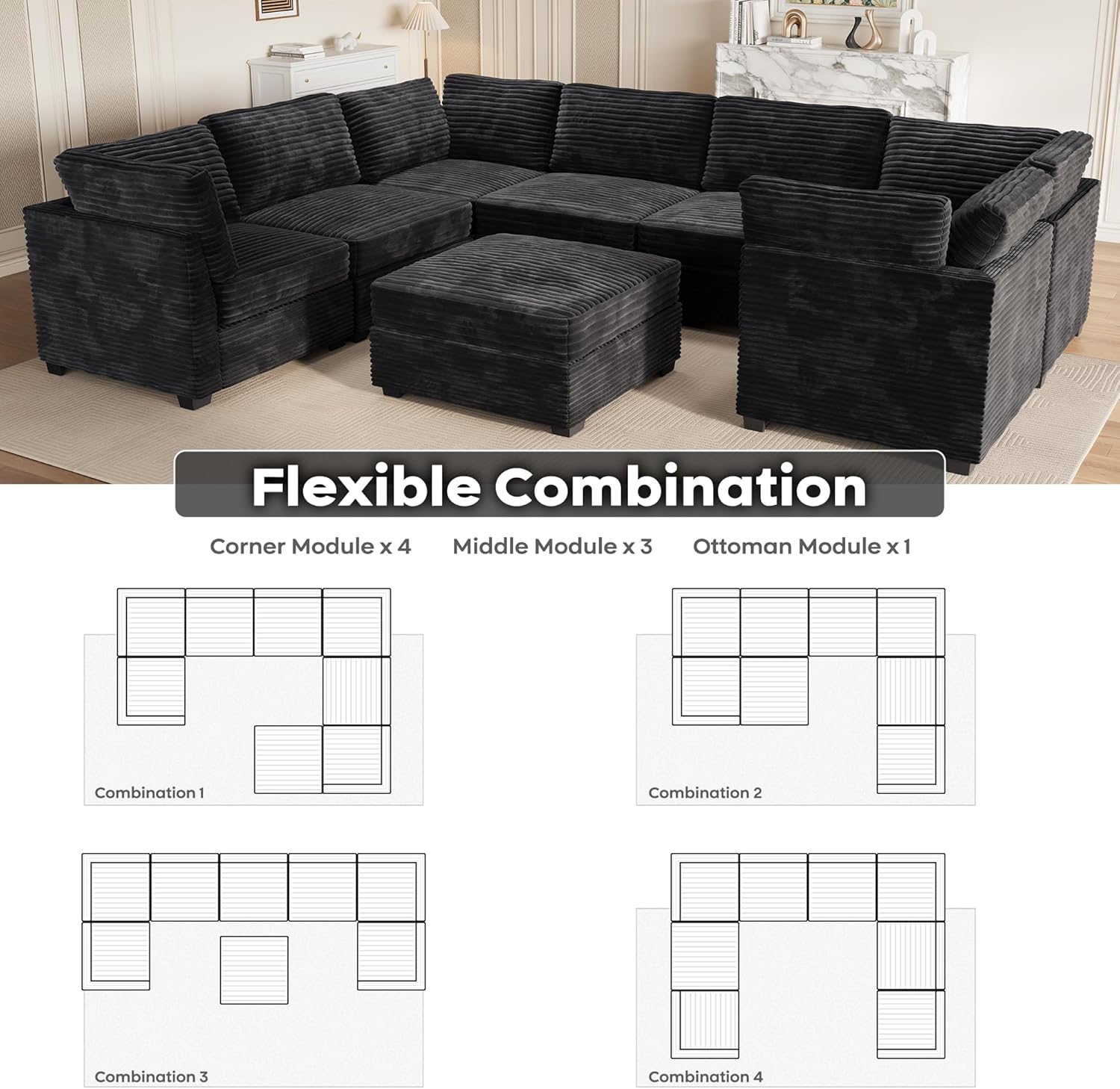 ovios Sectional Sofa Couch with U-Shape Chaise Sofa Bed, Comfy Modular Cloud Couches with Deep Seat, Modern Upholstered Plush Corduroy Sofas Set for Living Room, 8-Seater, Black