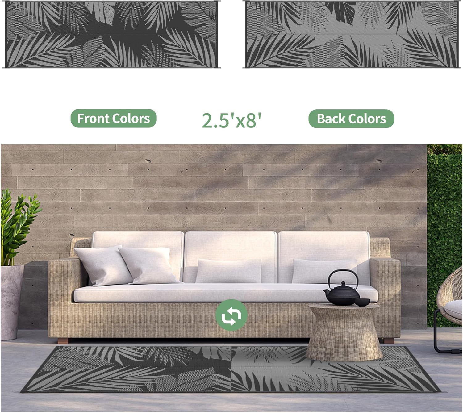GENIMO Outdoor Rug 2.5' x 8' Waterproof for Patios Clearance, Reversible Outdoor Plastic Straw Camping Rug Carpet, Large Area Rugs Mats for RV, Camper, Deck, Balcony, Porch, Beach, Picnic, Black&Grey