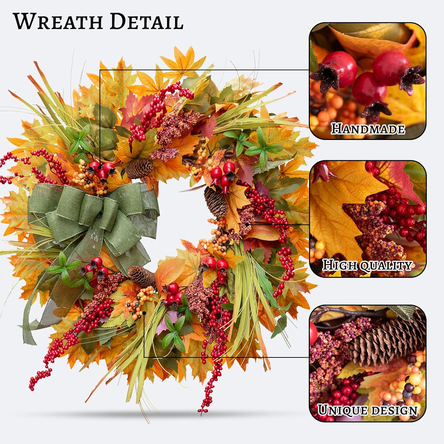 - 【Vibrant & Lifelike Fall Door Wreath】This 24 inch autumn wreaths for front door is filled with lifelike autumn leaves in warm tones, red berries, pine cones, and a charming green bow. It adds a stunning seasonal touch to your front door decor