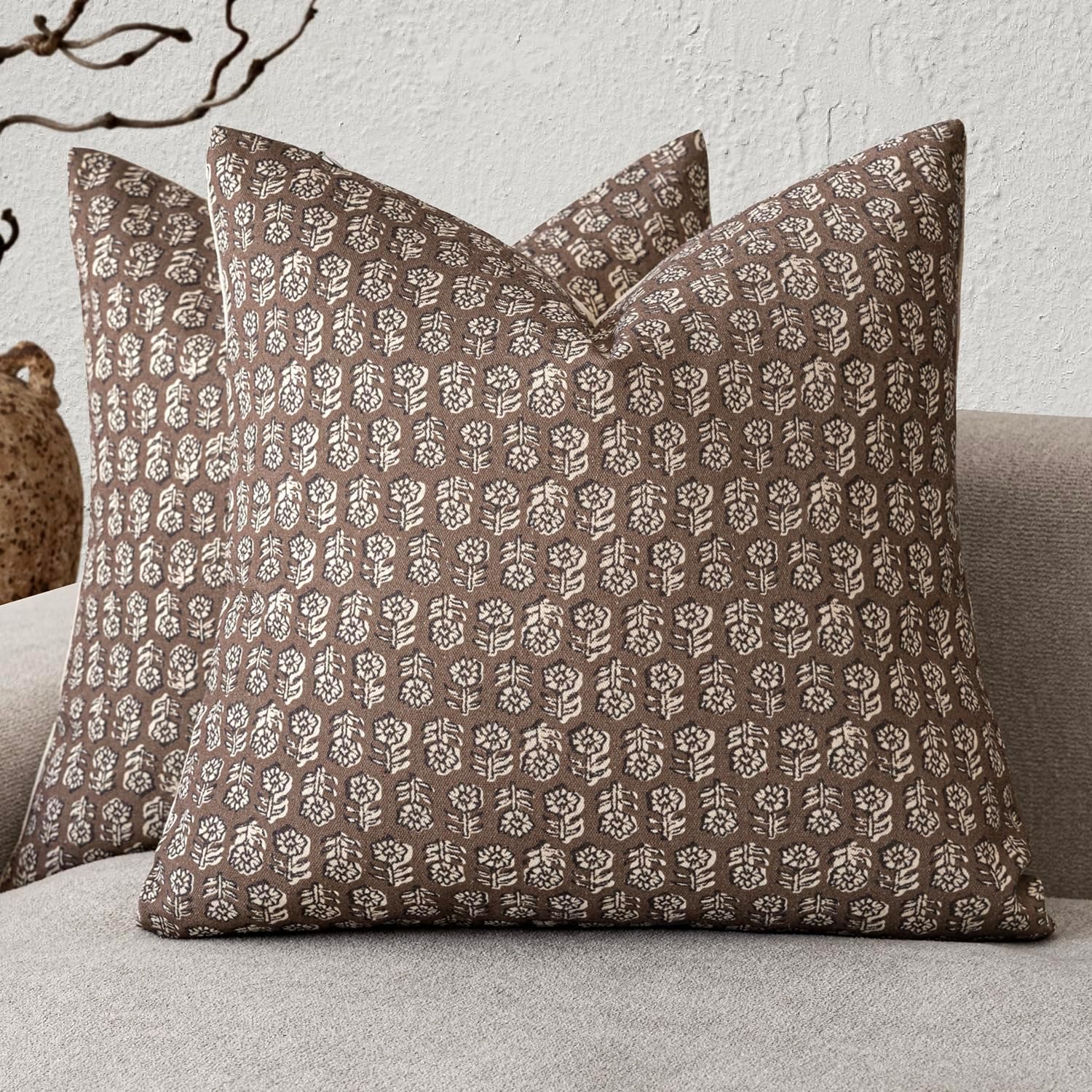 Foindtower Set of 2 Decorative Neutral Floral Print Throw Pillow Covers Vintage Accent Farmhouse Cushion Covers Boho Home Decor for Sofa Couch Chair Bedroom Living Room Outdoor,22×22 Inch,Brown