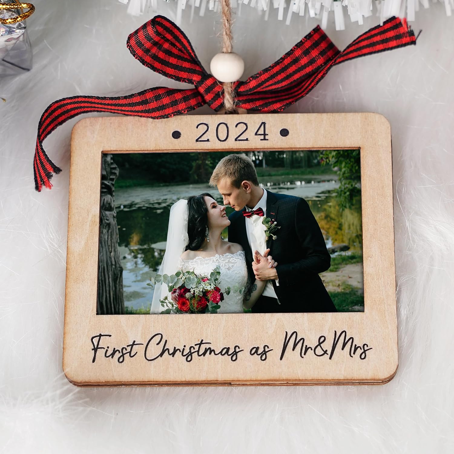 Christmas Photo Frame Ornament, 2024 Ornament, Wooden Picture Frame Ornaments With Hanging String (First Christmas As Mr & Mrs (Landscape))