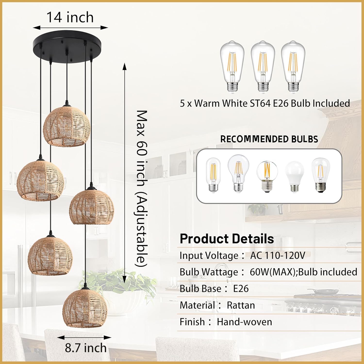 5-Light Woven Foyer Chandeliers for High Ceiling,5 Dome Boho Rattan Pendant Light Farmhouse Wicker Ceiling Light,rustic Hemp rope Light Fixture For Living Room Hallway Staircase Entryway(Bulb Incl.