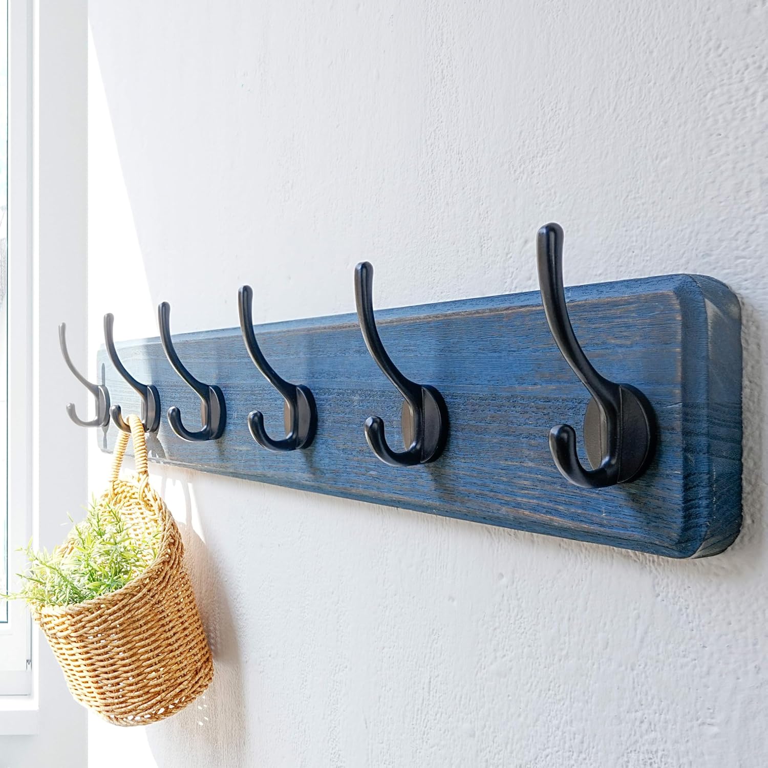 - 【STYLISH RUSTIC CHARM:】The wood hook rack features a unique, aged finish, exuding timeless rustic and farmhouse style. SIZES(INCH): 24 x 5-1/4 x 2-3/4; Including 1 x wooden coat rack wall mount with 10 dual hooks, mounting hardware, weathered blue & black color.