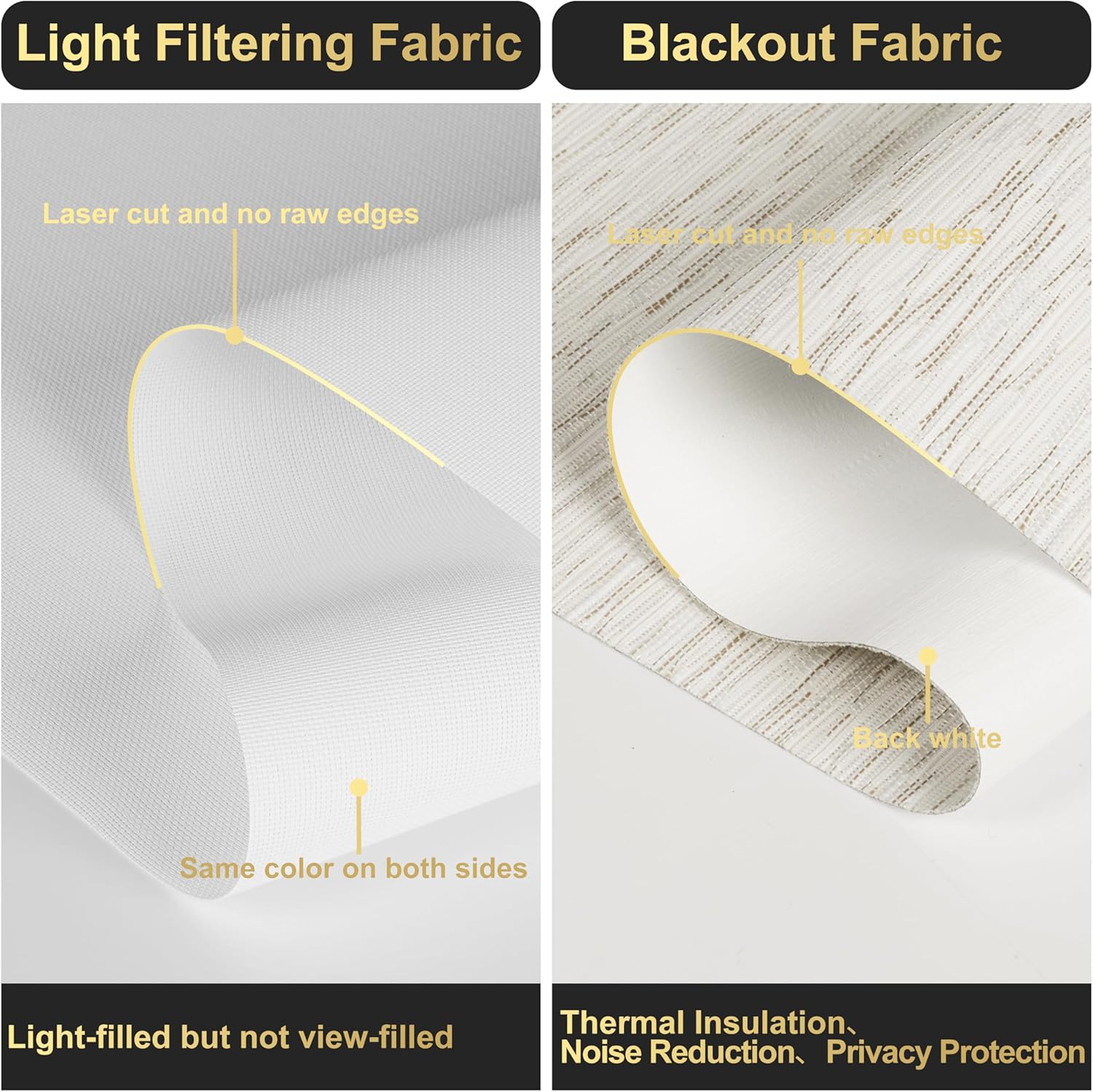 - MULTI-PURPOSE SHADE:Dual roller shades consisting of blackout and light filtering shades, blackout roller shade can 100% blackout,thermal insulation and UV Protection,so that you can experience quiet and comfort of the night during daytime;Light filtering roller shade allow light to filter into your room,and no glare,soft diffused light allow for perfect balance of light and darkness,and also enhances overall aesthetics of your home,allowing for a romantic and comfortable living environment.