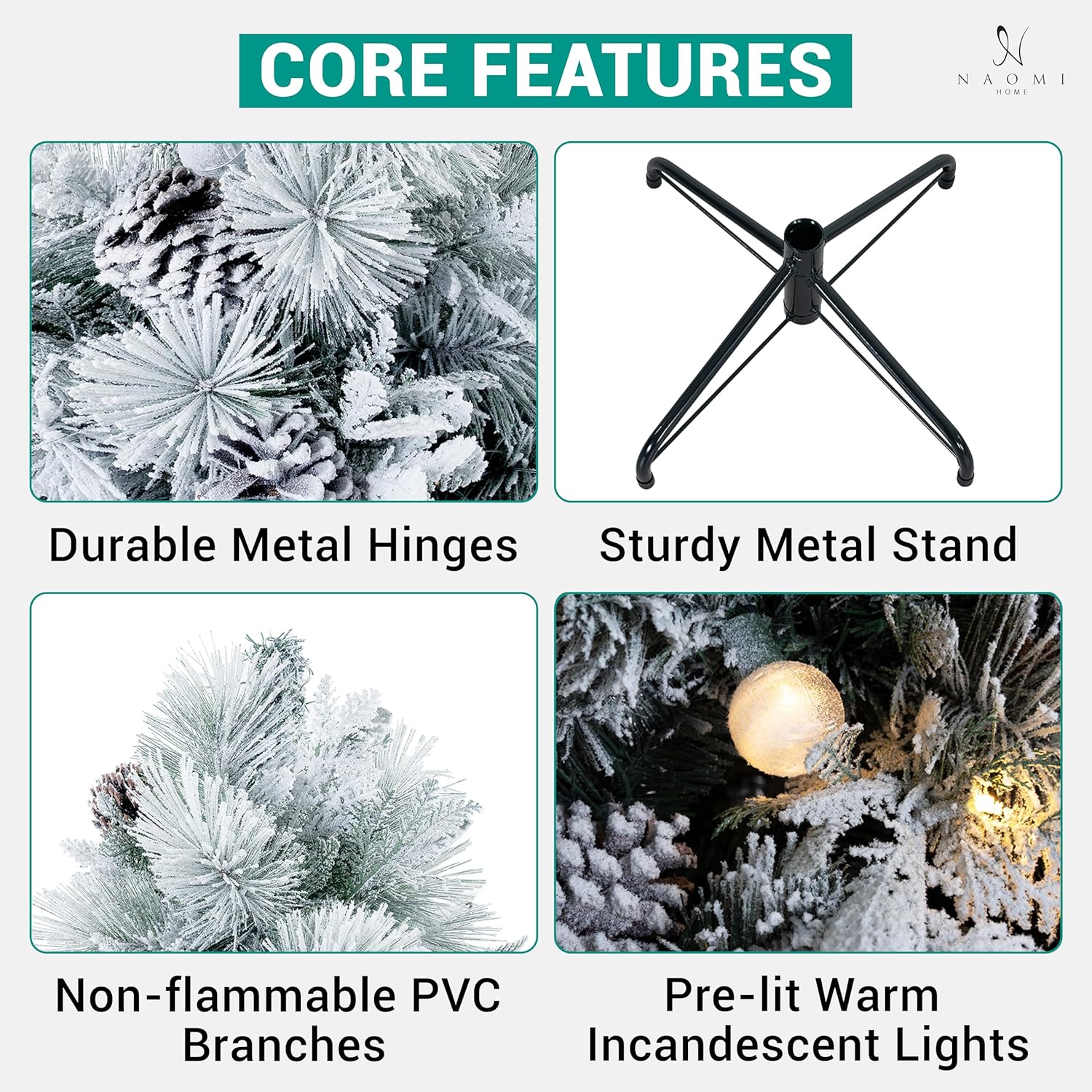 - WARM LIGHTS TO BRING MORE JOY : The Snow Flocked Christmas Tree comes Pre-lit with 720 incandescent lights that make setting up your tree a breeze. These lights emit a warm glow that highlights your decorations and holiday gifts making your place extra-special.
