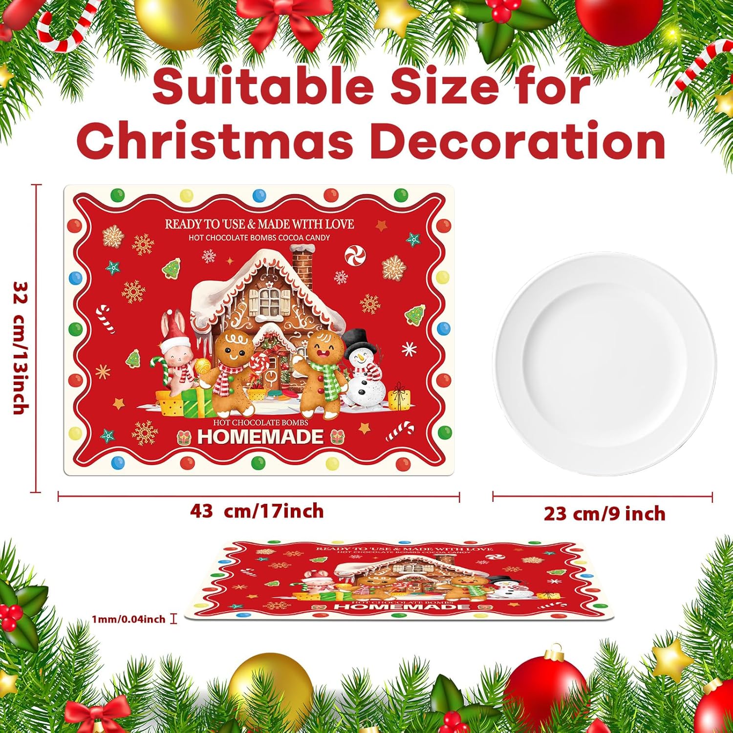 - Christmas placemats set of 6: You will get 6 pieces of Christmas winter plastic placemats. Christmas gingerbread plastic table mats measure 43 x 32cm/17x 13 inches, making it the ideal size to accommodate your Christmas party and events, which allows you to easily decorate your kitchen table mats and create a stunning centerpiece for your Christmas party.