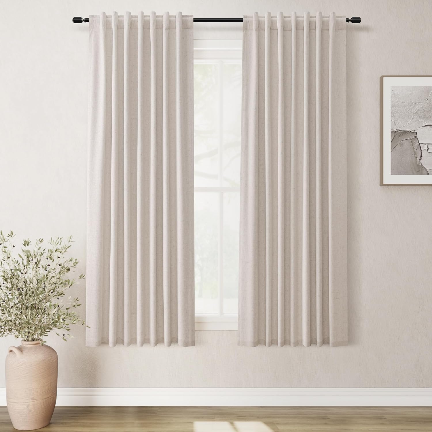 - 3 Hanging Options: Differ from the traditional curtains with grommet, BOODII linen curtains with back tab and rod pocket can full block sunlight fully. (1) Using the back tabs design to create an elegant pleated look and sit closer to the wall than traditional ring curtains, which helps to block out more sunlight; (2) Using rod pocket for a classic effect; (3) Using clip rings on track system or curtain rod, slide open/closed easily (clip rings are not included).