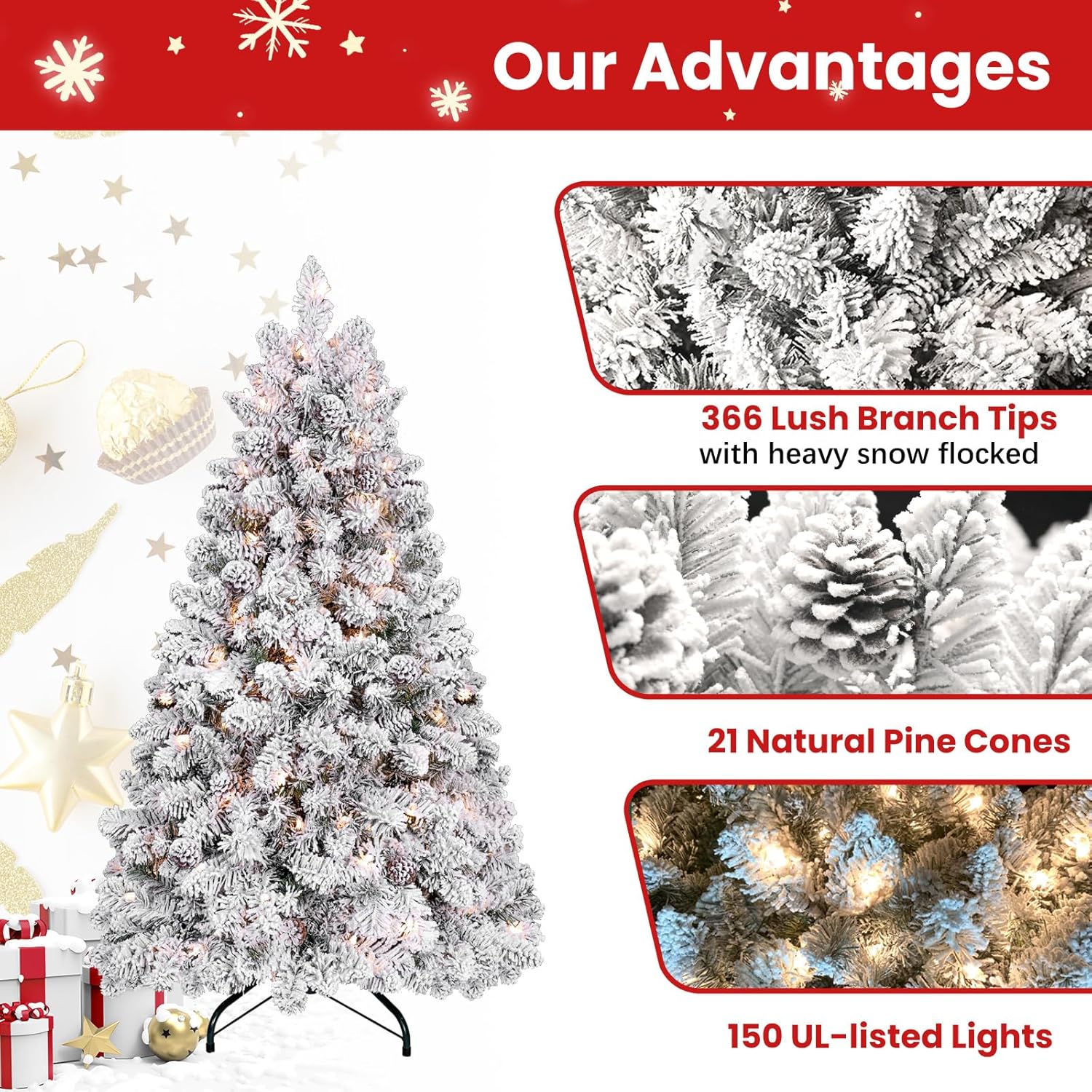 - pre-lit Christmas tree is designed with a snowy look, featuring pine cones and leaves covered in thick snow. It doesn't shed much and is easy to shape. The abundant branches and fully flocked appearance of this artificial Christmas tree create a strong wintry ambiance, enhancing the holiday atmosphere. With minimal decorations, it can effortlessly create a festive mood.