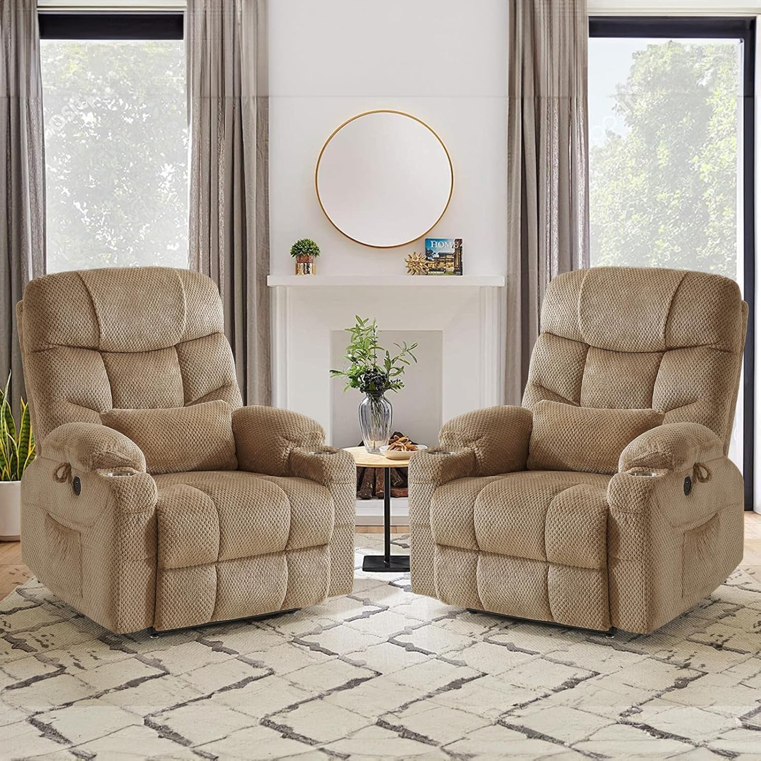 Oversized Dual Motor Lay Flat Power Lift Recliner Chair Set of 2 for Elderly with Massage and Heat, Textile Large Recliner Chair, Lift Chairs Recliner with Lumbar Pillow, Cup Holder, Beige