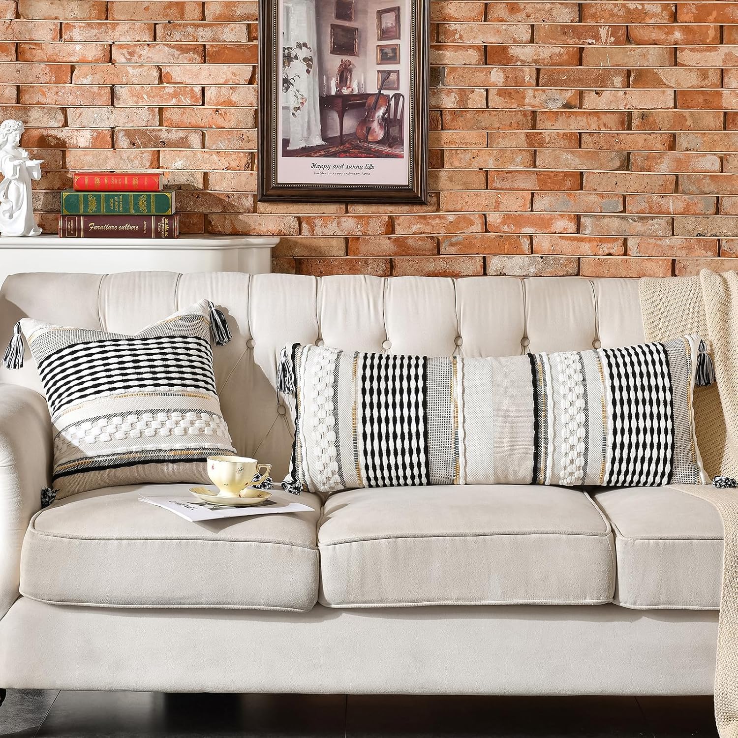 AmHoo Chenille Striped Textured Boho Throw Pillow Covers Aesthetic with Tassels Woven Decorative Pillow Case for Couch Bed Sofa Bedroom Modern Funky 18 x 18-Inch Black